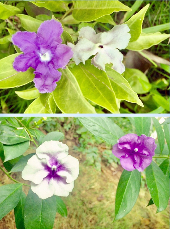 记得循着 "臭味"第一次见到鸳鸯茉莉的时候,认为这花能开两种颜色,蓝紫色和白色。后来才知道原来是因为变色。鸳鸯茉莉花初开为蓝紫色,渐变为雪青色,最后变为白色,由于花开有先后,在同株上能同时见到蓝紫色和白色的花。白色意味着花开到后期要凋谢了。
