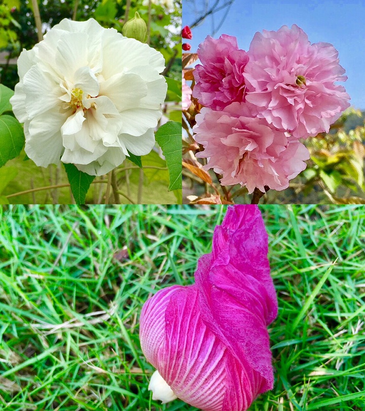 后来又见到几种这样的花,下面是木芙蓉,花初开时白色或淡红色,然后变深红色,最后在紫红色的时候凋落。