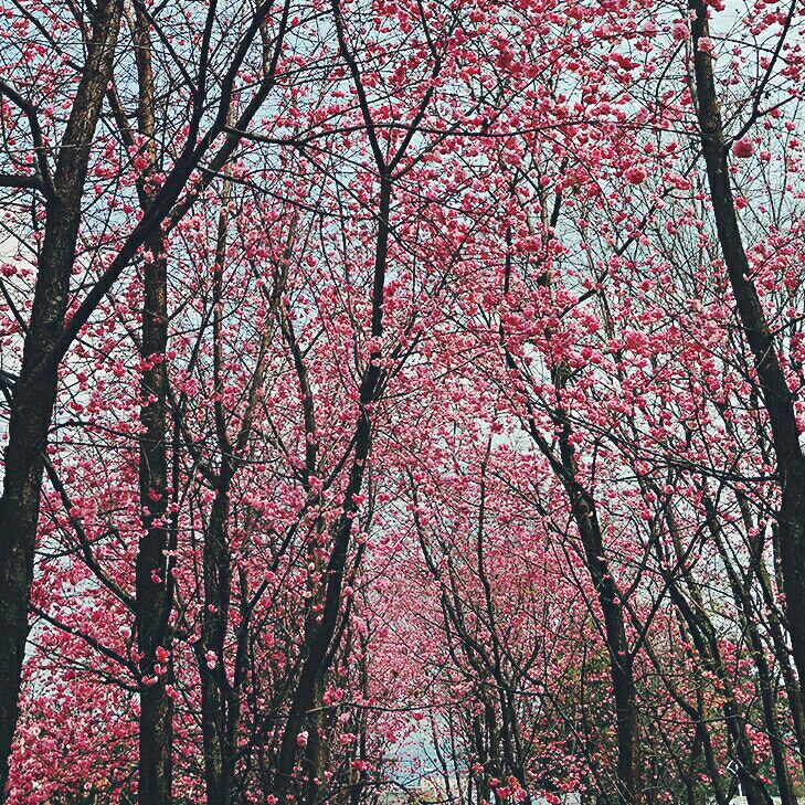经历过一夜的宁静,樱花树下早已被铺上了一层厚厚的淡粉色花瓣,让人舍不得踩下去,生怕破坏了这如诗的美景。