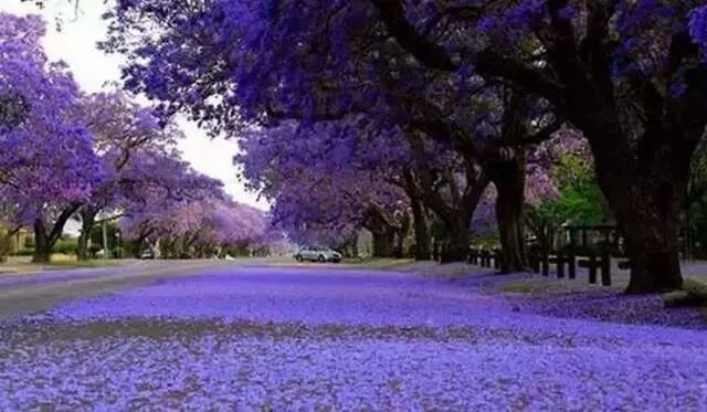 当那些美丽的花朵从树上掉落下来,整个城市就被铺上了温馨的紫色地毯,仿佛走进少女的梦境一般。蓝花楹的花语是“在绝望中等待爱情”。