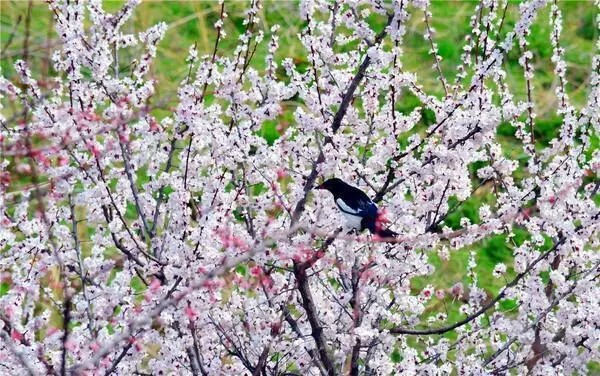 在连绵起伏的山披上,小草探出稚嫩的芽芽,远远看上去一片嫩绿。山坡上点缀着的是一棵棵开满粉色花朵的杏树,整个杏花沟变成了一个粉色与绿色相间的梦幻王国。