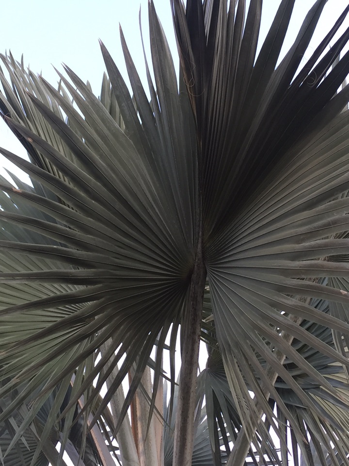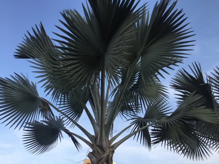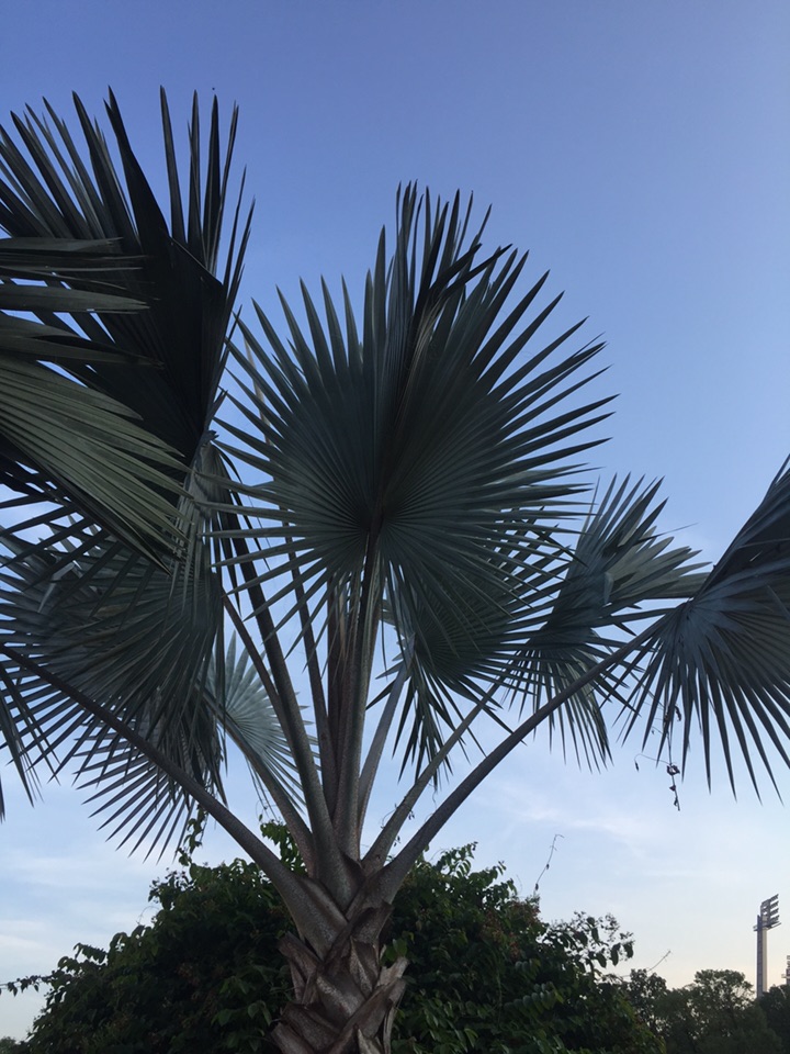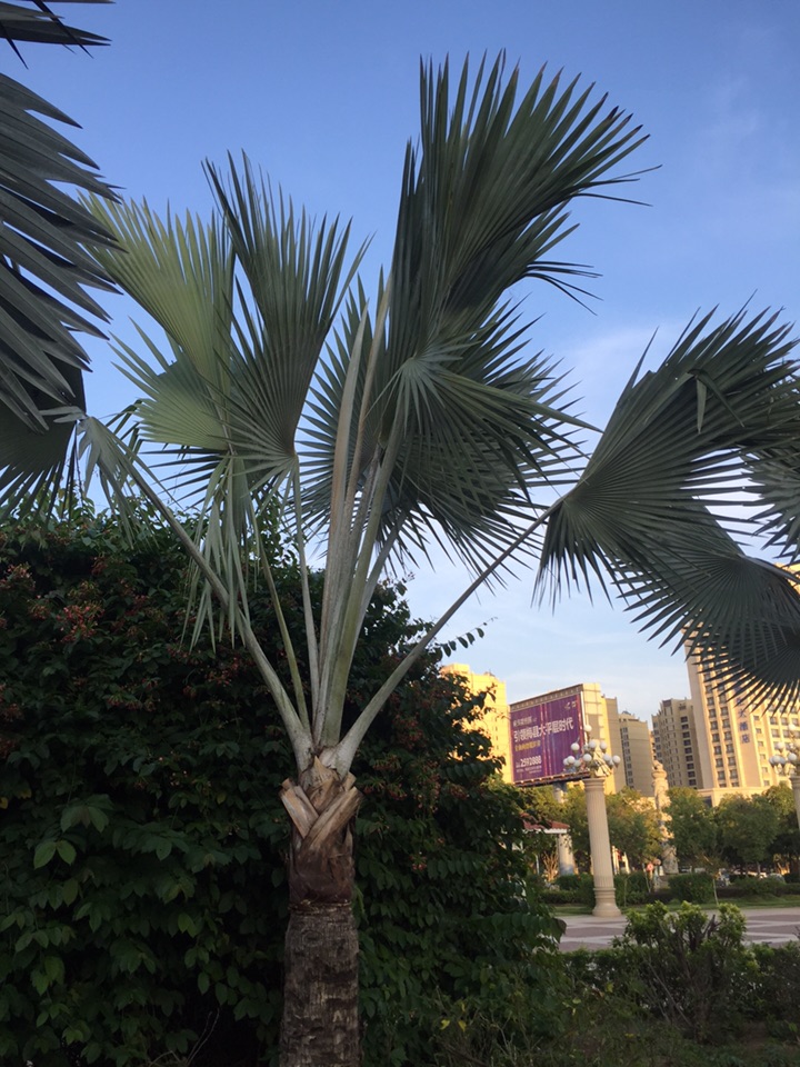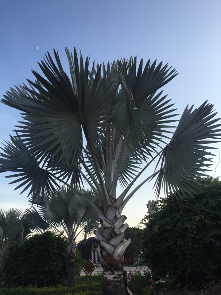 它的树型也很高大,雄伟,树干笔直。上度娘一查,有点被震撼了。以下是度娘资料:贝叶粽的生命期大约30~80年,一生只开一次花。 就像一般棕榈科的花,贝叶棕花朵很小,颜色米色或象牙色,谈不上美丽,而且有臭味。但贝叶棕是单杆型顶生花序,整个花序有一两米高,非常壮观,加上其生命形态很奇特,更显得迷人。