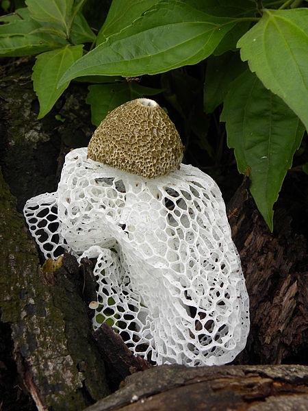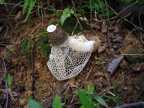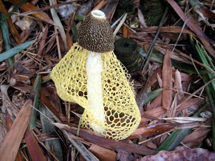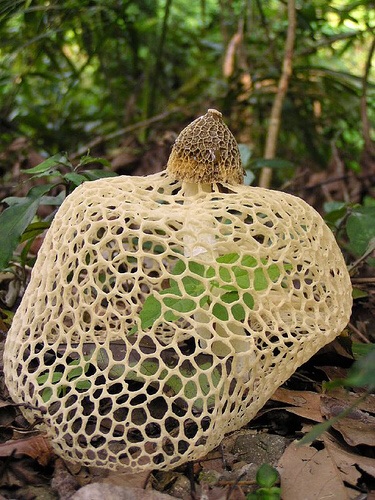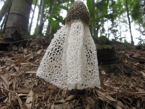 竹荪又名竹笙、竹参,常见并可供食用的有3种:长裙竹荪、短裙竹荪和红托竹荪,是寄生在枯竹根部的一种隐花菌类,形状略似网状干白蛇皮,它有深绿色的菌帽,雪白色的圆柱状的菌柄,粉红色的蛋形菌托,在菌柄顶端有一围细致洁白的网状裙从菌盖向下铺开,被人们称为“雪裙仙子”、“山珍之花”、“真菌之花”、“菌中皇后”。竹荪营养丰富,香味浓郁,滋味鲜美,自古就列为"草八珍"之一。