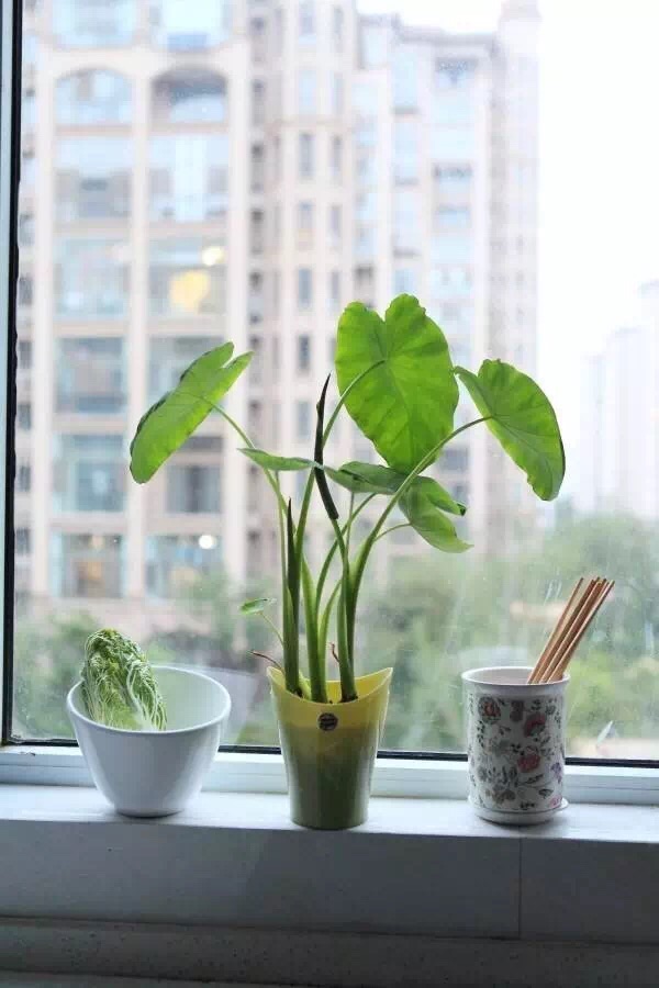 我也在家种了一颗芋头观赏,可是他越长越大啊,最后都成一颗落地植物了!