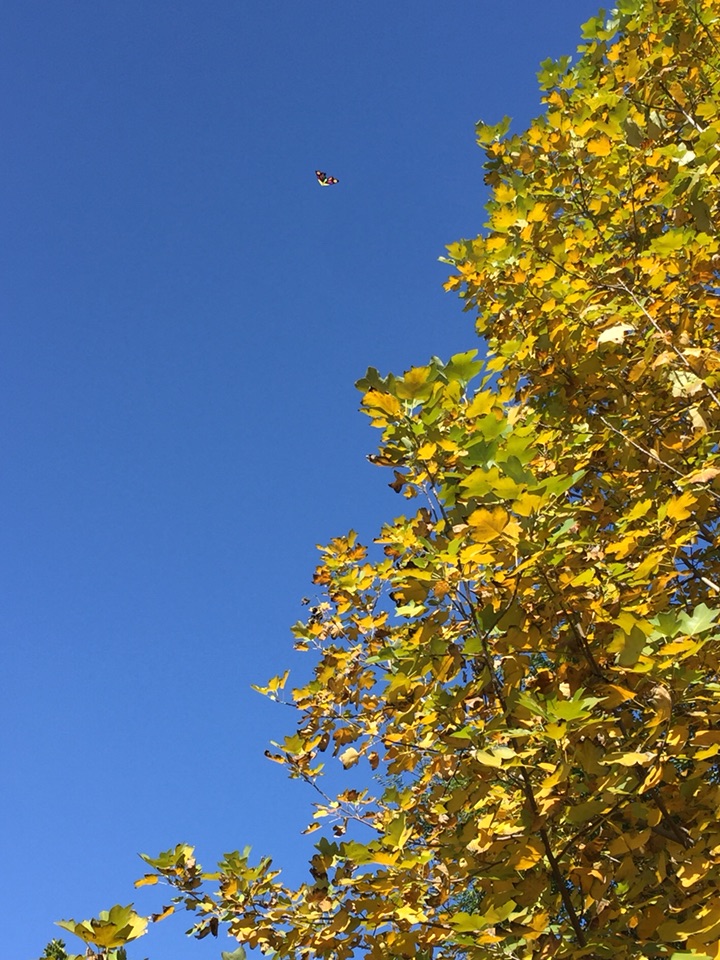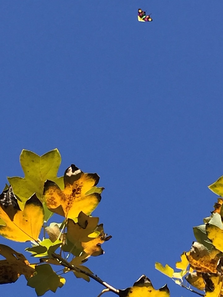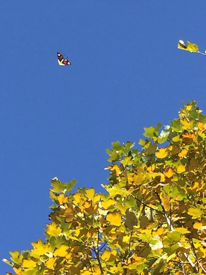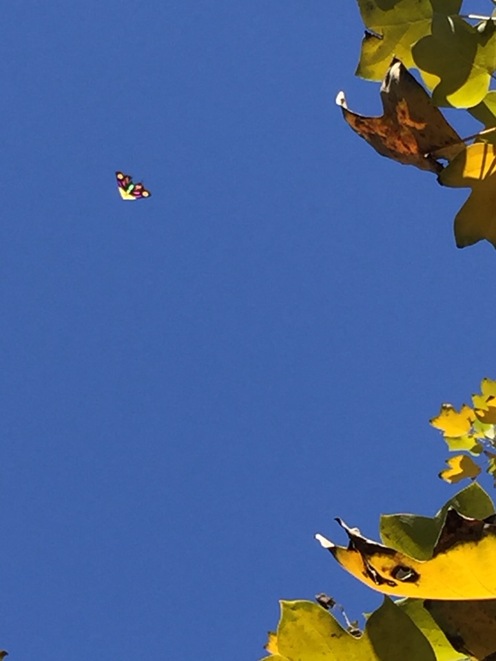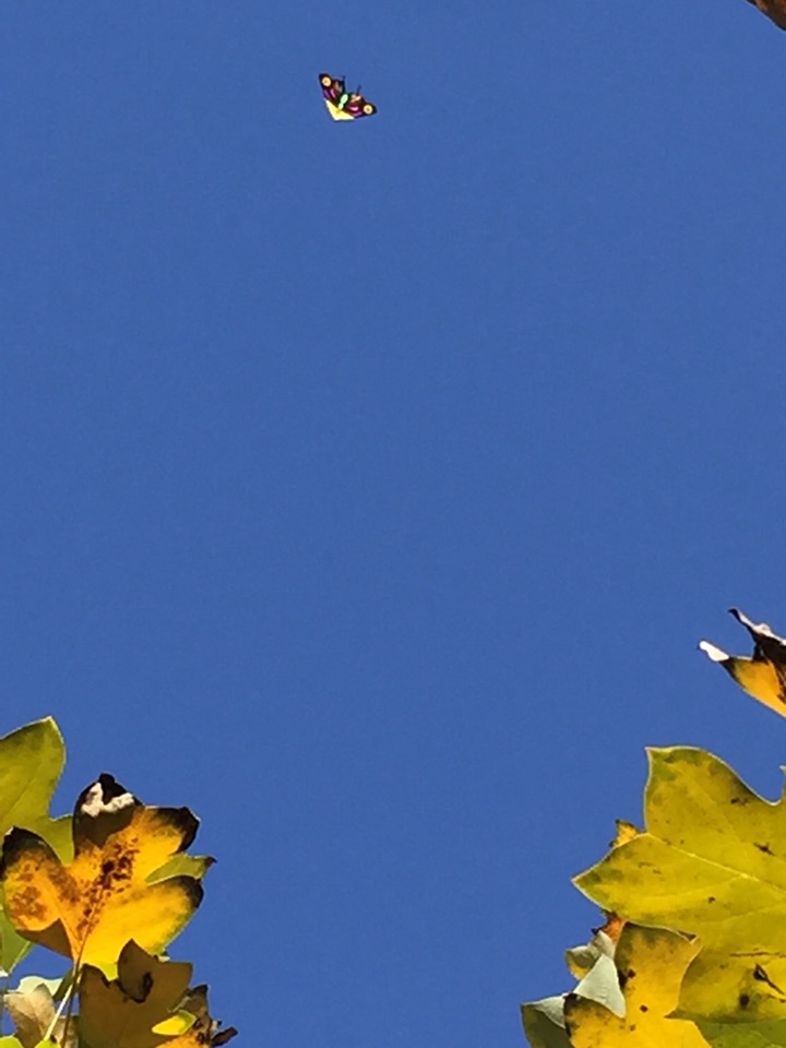 拍红叶拍树木,一抬头发现一只蝴蝶风筝在蓝天里飘着。映衬着天空格外迷人。