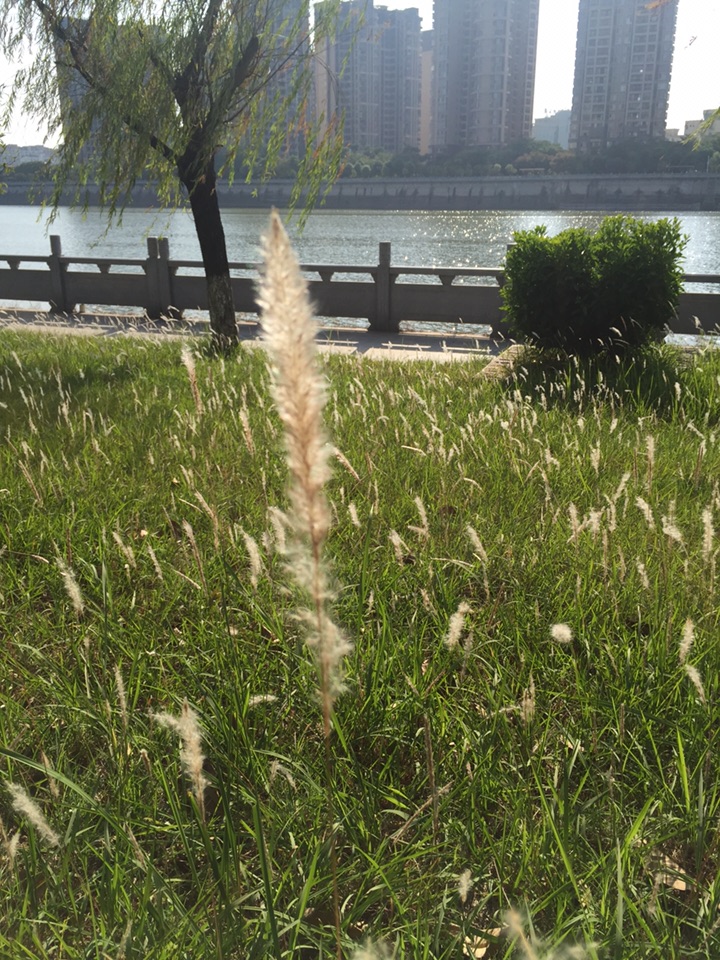 散步到沿江河畔边,意外发现一大片的白茅草,在秋日的暖阳里,蔚然成景。