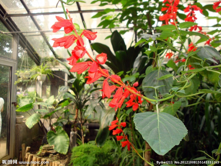 亚灌木状草本,高可达90厘米。茎钝四稜形,具浅槽,无毛。叶卵圆形或三角状卵圆形,长2.5-7厘米,宽2-4.5厘米,先端渐尖,基部截形或圆形,稀钝,边缘具锯齿,上面绿色,下面较淡,两面无毛,下面具腺点;茎生叶叶柄长3-4.5厘米,无毛。轮伞花序2-6花,组成顶生总状花序,花序长达20厘米或以上;苞片卵圆形,红色,大,在花开前包裹着花蕾,先端尾状渐尖;花梗长4-7毫米,密被染红的具腺柔毛,花序轴被微柔毛。花萼钟形,红色,开花时长约1.6厘米,花后增大达2厘米,外面沿脉上被染红的具腺柔毛,内面在上半部被微硬伏毛,二唇形,唇裂达花萼长1/3,上唇三角状卵圆形,长5-6毫米,宽10毫米,先端具小尖头,下唇比上唇略长,深2裂,裂片三角形,先端渐尖。花冠红色,长4-4.2厘米,外被微柔毛,内面无毛,冠筒筒状,直伸,在喉部略增大,冠檐二唇形,上唇直伸,略内弯,长圆形,长8-9毫米,宽约4毫米,先端微缺,下唇比上唇短,3裂,中裂片半圆形,侧裂片长卵圆形,比中裂片长。能育雄蕊2,近外伸,花丝长约5毫米,药隔长约1.3厘米,近伸直,上下臂近等长,上臂药室发育,下臂药室不育,下臂粗大,不联合。退化雄蕊短小。花柱与花冠近相等,先端不相等2裂,前裂片较长。花盘等大。小坚果椭圆形,长约3.5毫米,暗褐色,顶端具不规则极少数的绉折突起,边缘或稜具狭翅,光滑。花期3-10月。