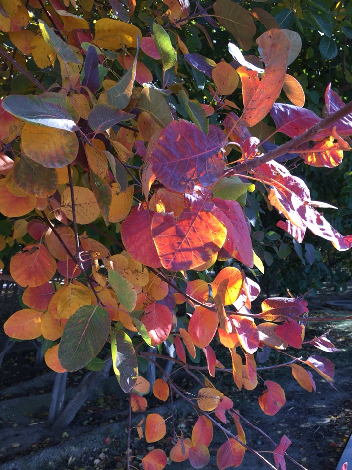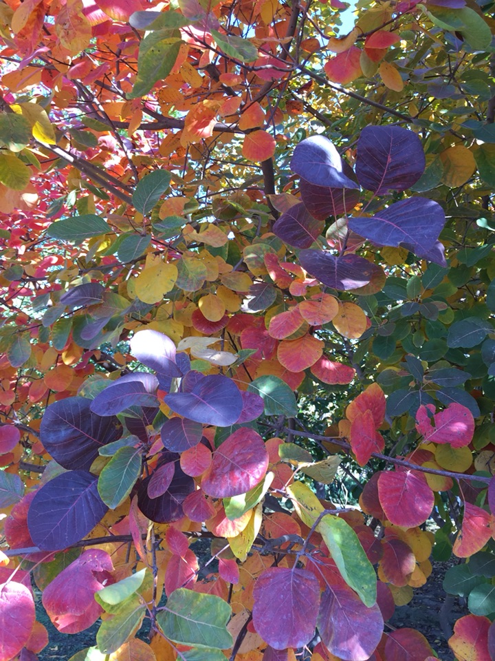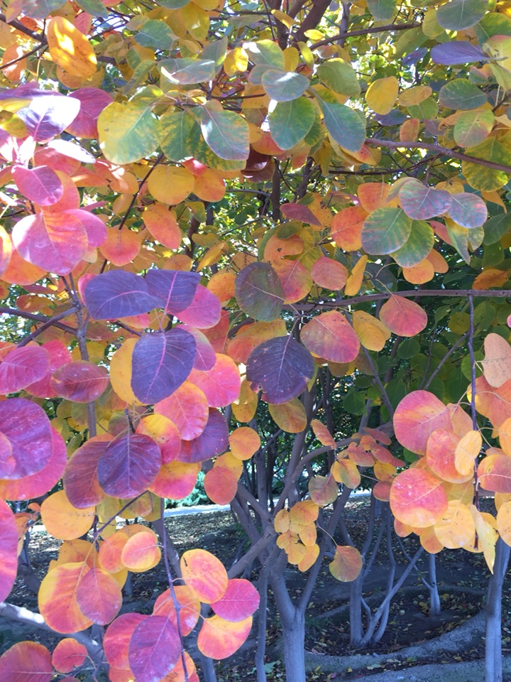 翻看图片,10月28日拍的这棵黄栌印象太深了,11月4日再去已经不是这么斑斓。一棵树,集中了深绿、浅绿、桔红、桔黄、深紫、淡紫、红色、黄色……十多种色彩同时绽放,令人惊艳,围着它不停地看,不停地拍,感慨只有大自然神奇的画笔才有这样的魔力吧。
