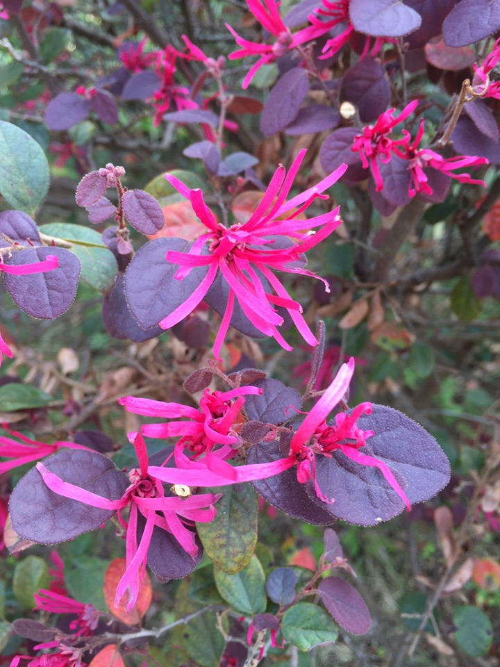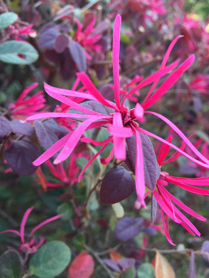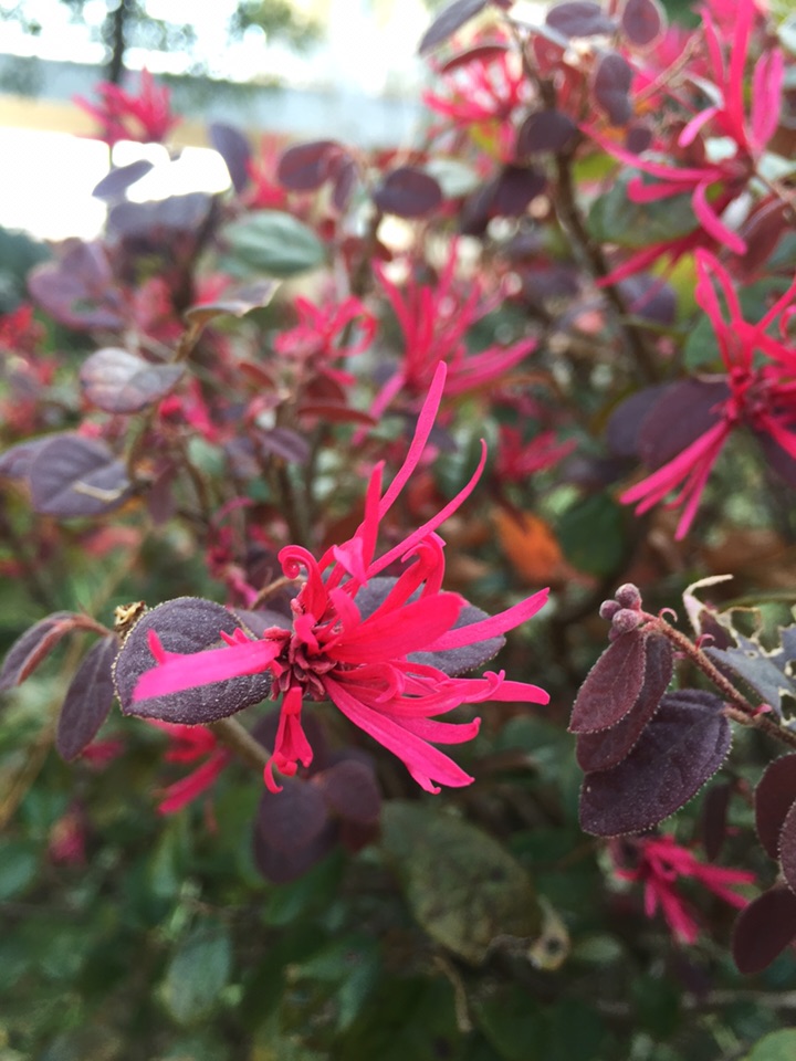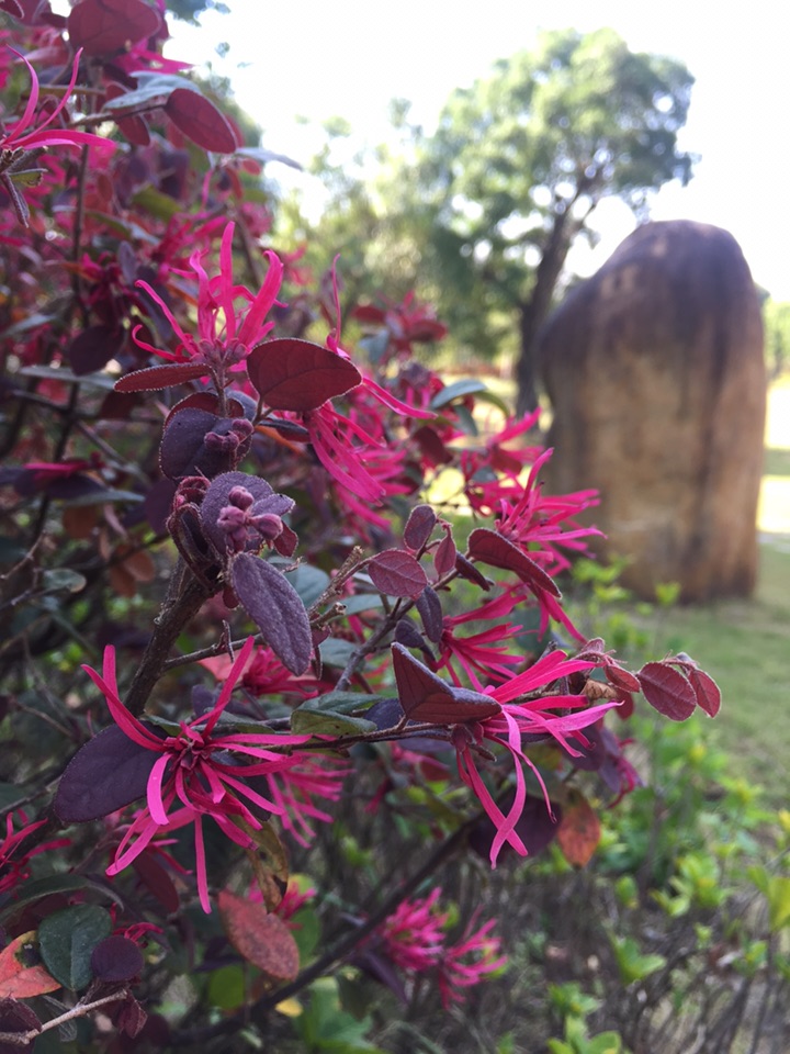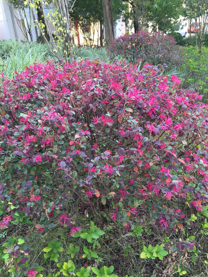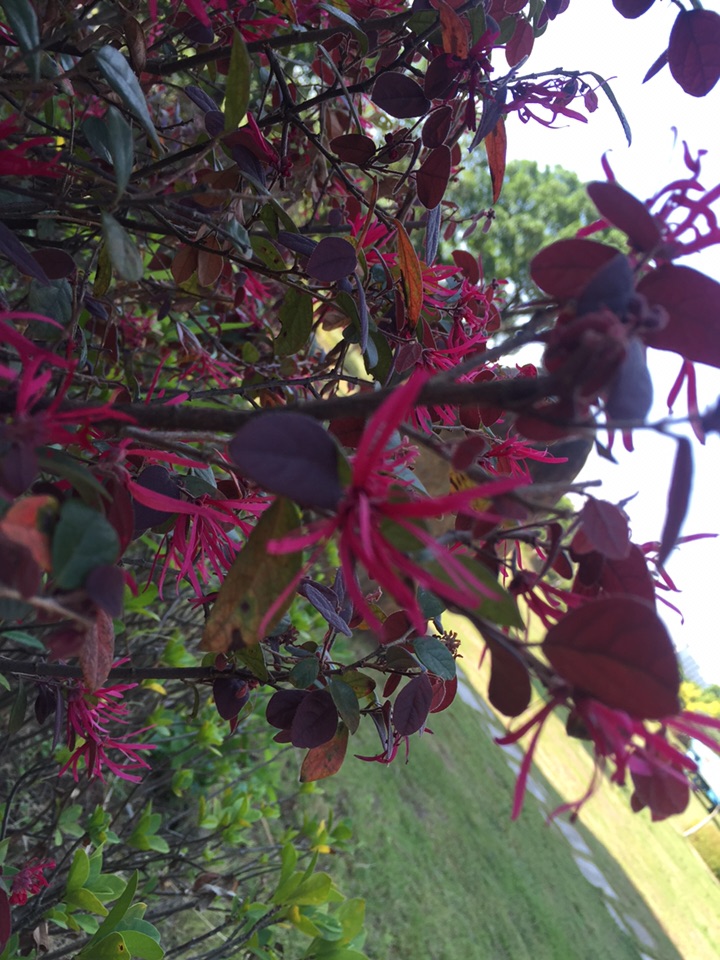 一直以为,红花檵木应该是赏叶的植物,因为我们这里的道路两旁太多了,有些公共地方甚至把它作为篱笆墙。也许就是因为多吧,它一直没有引起我的注意。所以当我远远望见它头上的红色时,我竟然以为那些是熊孩子玩的红色纸屑。待走近时,认真观察,才确定那些确实很花,是红花檵木的花儿。