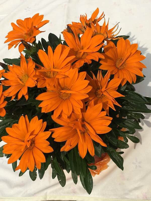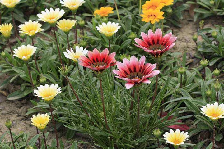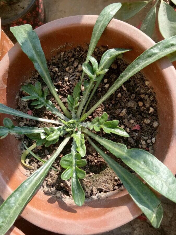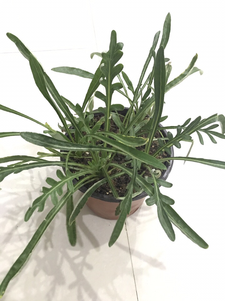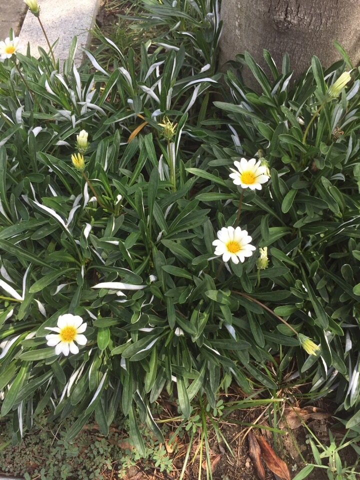 以上图片来自网络, 从图片中可以看出,勋章菊的叶子全部从基部生出,叶型狭长或伴有羽裂,羽裂的形状与菊花的叶型显然不同。(但她的叶背因有细密的白绵毛而常呈白色这点与部分菊花相似)。花茎也从根部生出,不长,一根花茎上只开一朵花,并没有多头的状况,并且茎杆上没有任何叶子。其花色丰富,下图中含有其数种常见花色