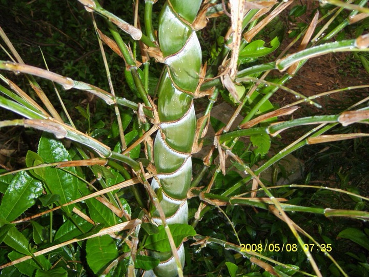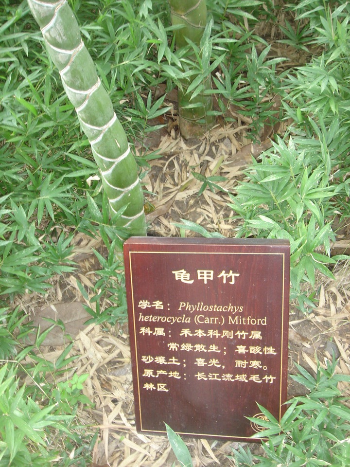 龟甲竹(学名:Phyllostachys heterocycla (Carr.) Mitford),竿高达20余米,粗者可达20余厘米,幼竿密被细柔毛及厚白粉,箨环有毛,老竿无毛,并由绿色渐变为绿黄色;基部节间甚短而向上则逐节较长;竿环不明显,低于箨环或在细竿中隆起。箨鞘背面黄褐色或紫褐色;箨耳微小,繸毛发达;箨舌宽短,强隆起乃至为尖拱形,边缘具粗长纤毛;箨片较短,长三角形至披针形;叶耳不明显,鞘口繸毛存在而为脱落性;叶舌隆起;叶片较小较薄。花枝穗状,基部托以4-6片逐渐稍较大的微小鳞片状苞片;佛焰苞通常在10片以上,常偏于一侧,呈整齐的复瓦状排列。小穗仅有1朵小花;小穗轴延伸于最上方小花的内稃之背部;颖1片,顶端常具锥状缩小叶有如佛焰苞。花丝长4厘米,花药长约12毫米;柱头3,羽毛状。颖果长椭圆形,顶端有宿存的花柱基部。笋期4月,花期5-8月。