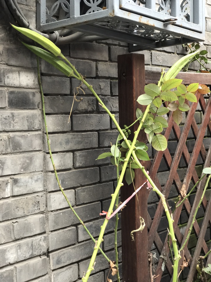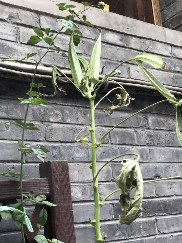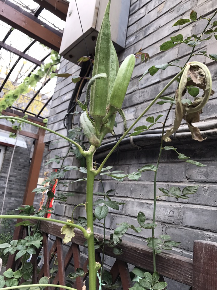 百度词条: 秋葵——又名黄秋葵、羊角豆、咖啡黄葵、毛茄、黄蜀葵,民间也称洋辣椒,原产地印度,素有蔬菜王之称。在北京很多人都爱拿着盆种上那么几株,也许并不是为了吃,纯属观赏娱乐罢了。你看,要不这么多的秋葵何以零落在枝头?
