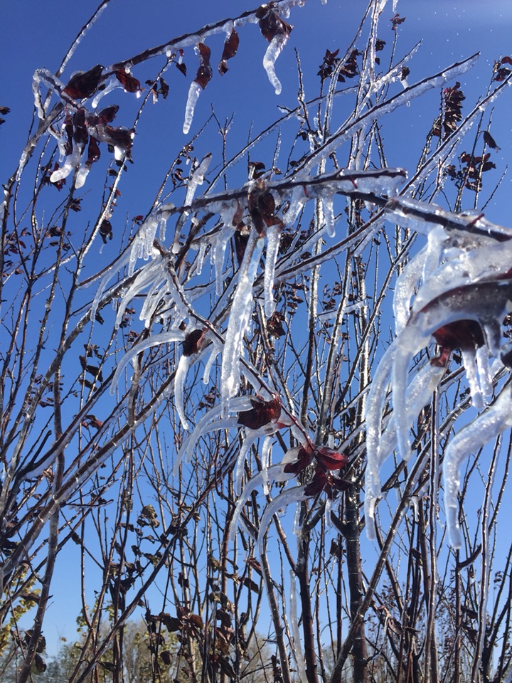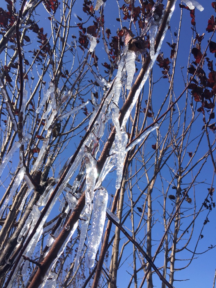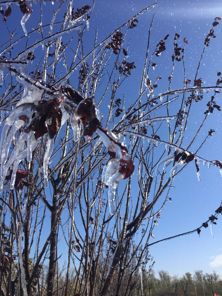 浇地的喷灌水雾在树上凝结成冰,可想今天的风有多冷,体会滴水成冰的严寒滋味。