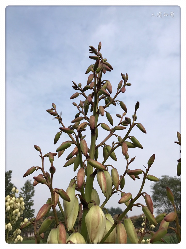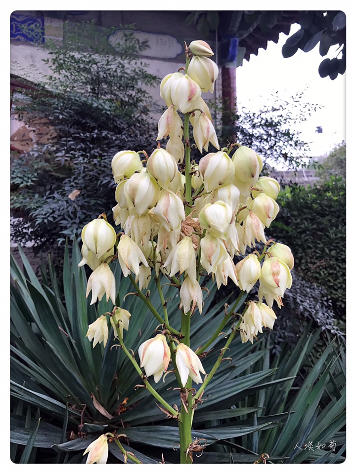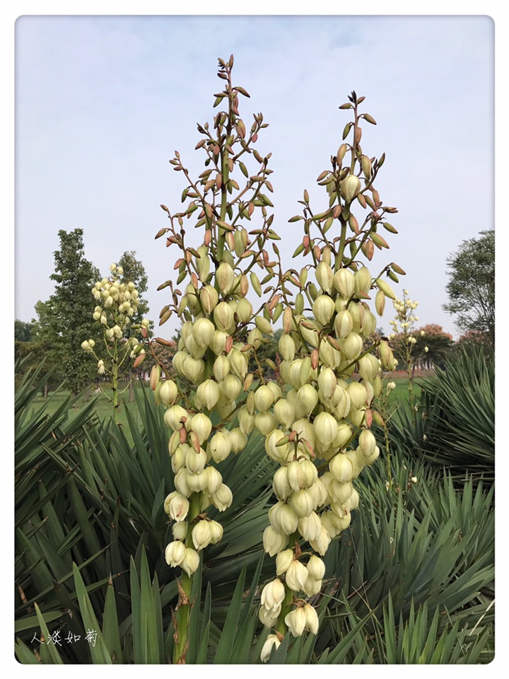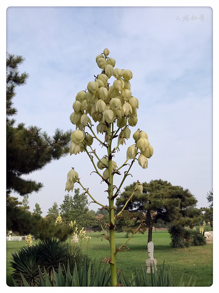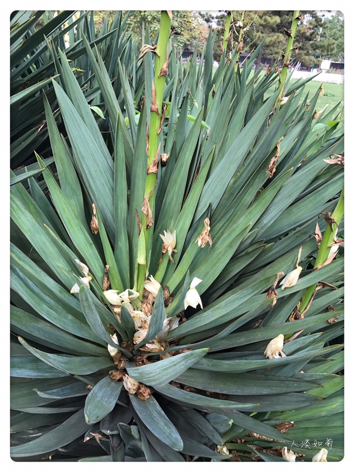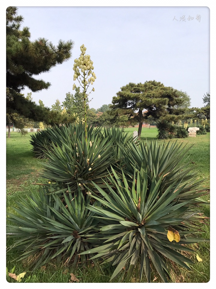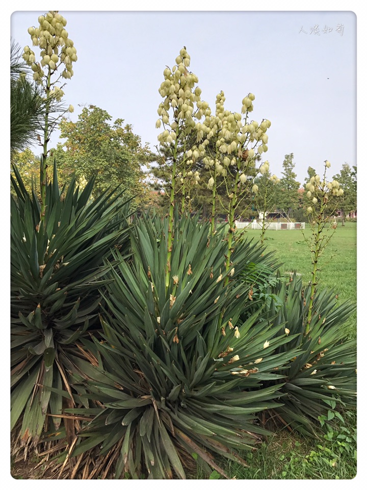 判断它是丝兰还是凤尾丝兰着实费了一番功夫,最后确定其为丝兰。依据一是叶上有刺,二是秋季开花,三是花杯形,白色,外缘白绿色略带红晕。