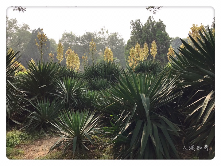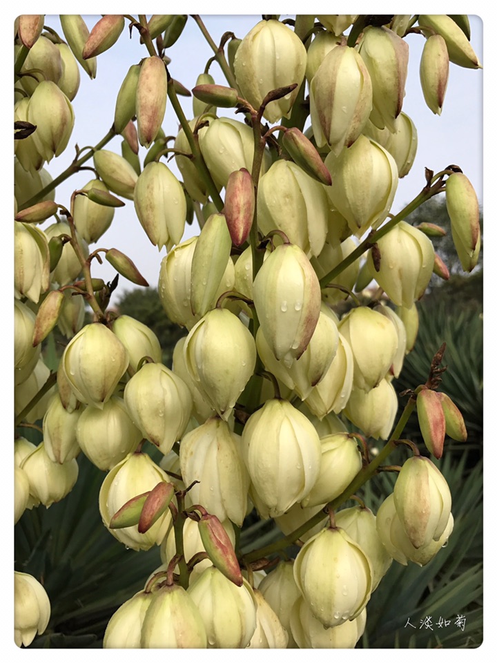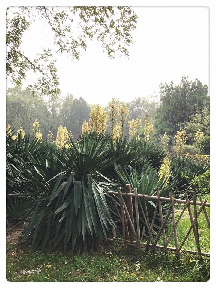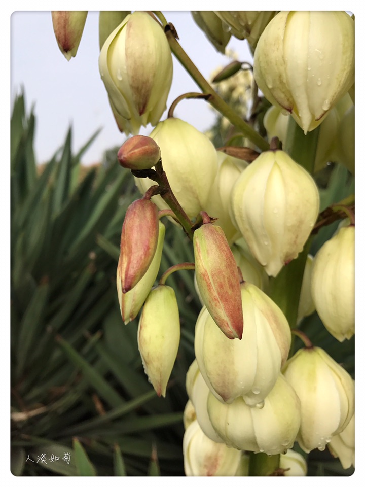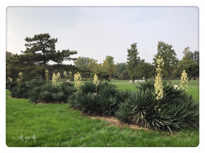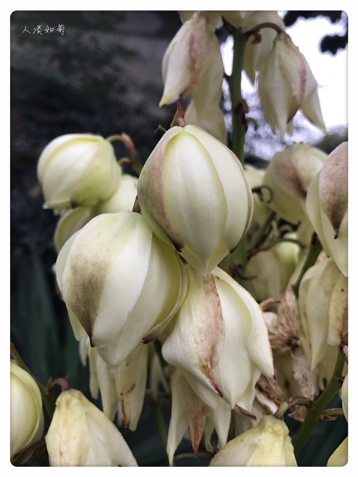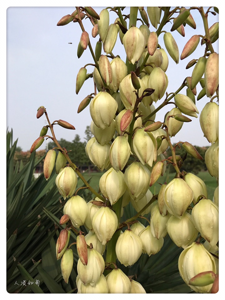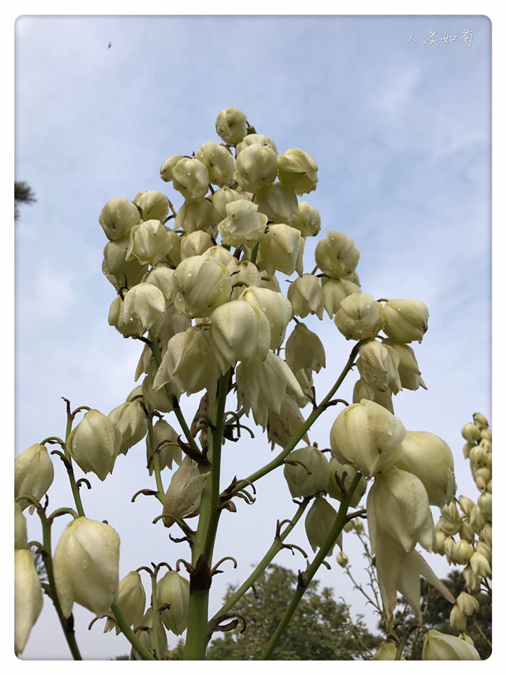 判断它是丝兰还是凤尾丝兰着实费了一番功夫,最后确定其为丝兰。依据一是叶上有刺,二是秋季开花,三是花杯形,白色,外缘白绿色略带红晕。