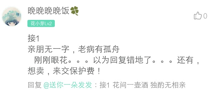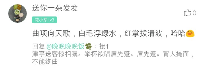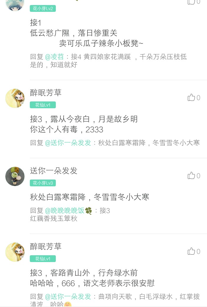 借这说一句,因为是接龙,所以不用回复回复你的那句诗,按最新的接就可以了