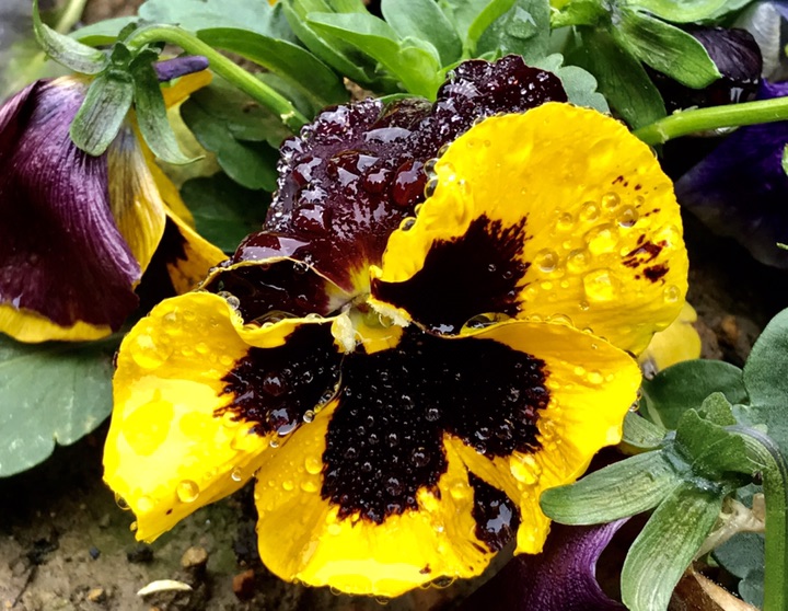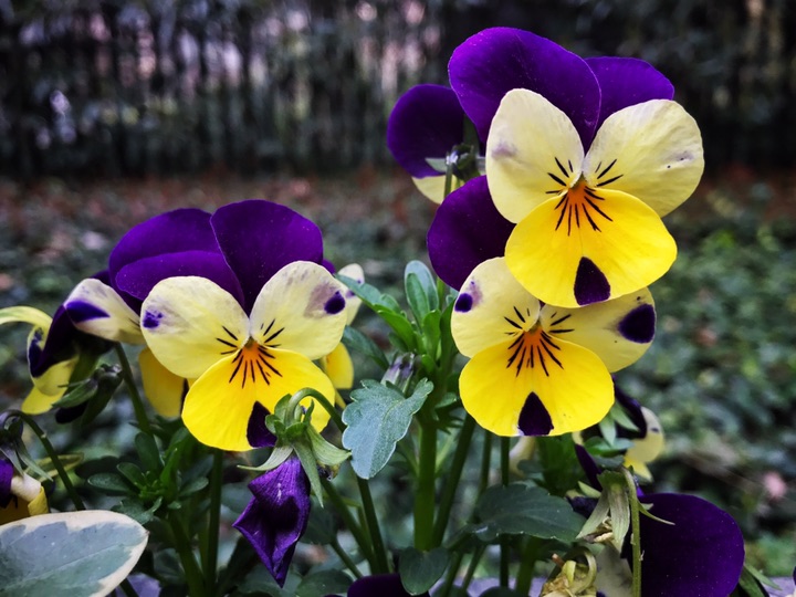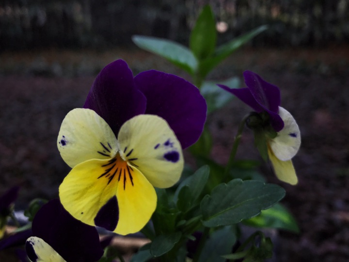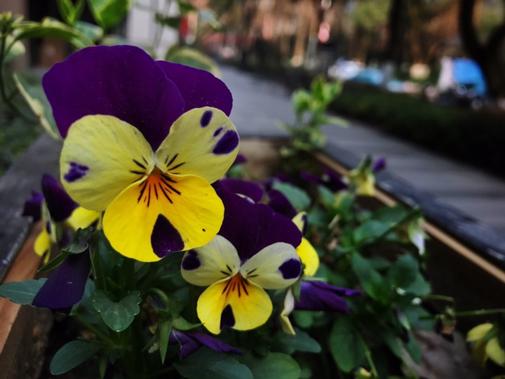 见惯了满院子的三色堇,某天在和街突然看见这种貌似三色堇的花,惊讶于她的娇小玲珑而又身段挺拔,便怀疑这是不是三色堇,叶梗有10公分左右,不像三色堇那样匍匐在地,叶梗顶生小花,花比三色堇小,上两片下三片的花瓣,上瓣深紫,下瓣亮黄,花心的条纹像猫脸,透着欢笑,让人无法不喜欢。后查实,这花是角堇(放上两张三色堇图比照用)