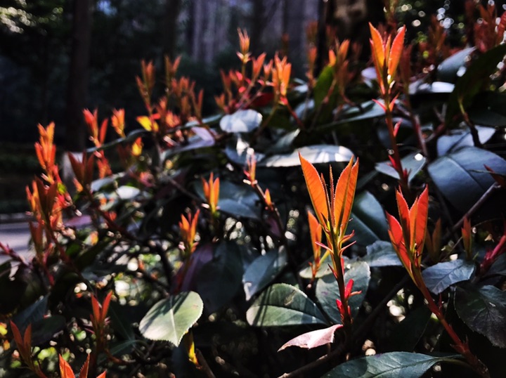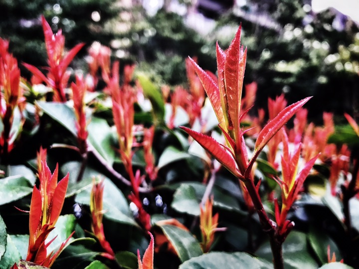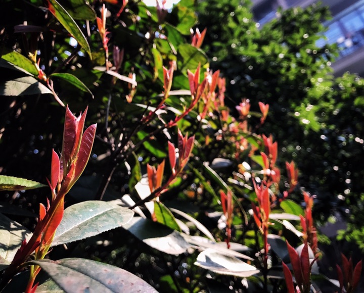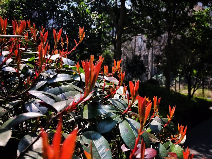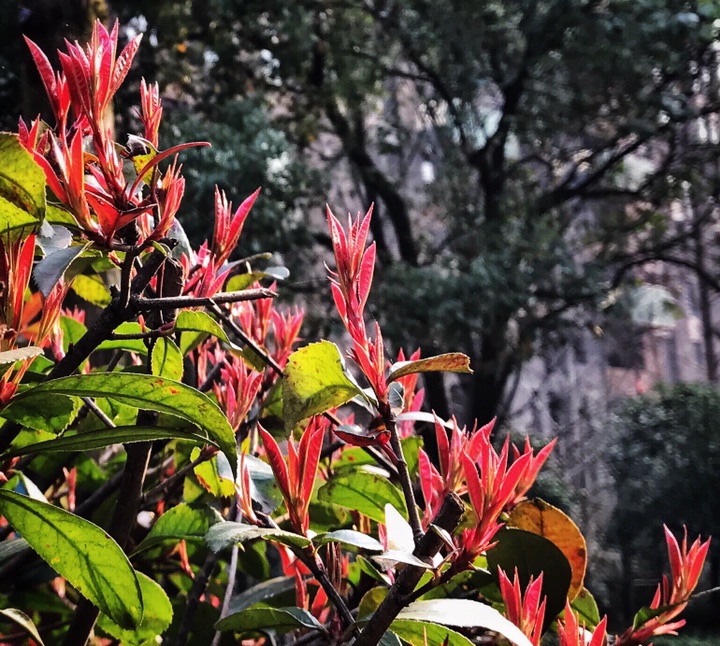 石楠,被修剪成球形的低矮灌木,在和家园随处可遇,并不稀罕。但初春时节,石楠还是让我刮目相看,你看啊你看,门前老树发新芽,枝头又见点点红,能不驻足围观?!都说石楠花语意孤独,我怎么觉得这花与花语正好相反,春阳照耀着满院子的红树芽,气氛好热闹喜庆,哪有孤独寂冷的滋味,倒是石楠的枝干,埋没在红叶之下,静静地支撑着闹热的嫩红,很会闹中取静。