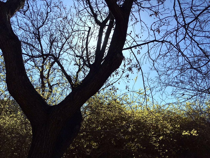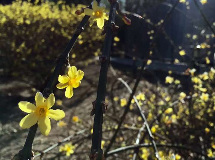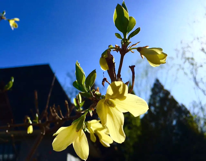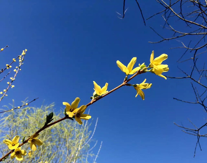 早春赏花,身边总有人把连翘误解为迎春。连翘与迎春的区分方法,1.连翘花开四瓣, 迎春花开六瓣。2.连翘结子,迎春不结子 。3.连翘花期晚于迎春,连翘盛开时,迎春已接近尾声。 还有将连翘的翘误读为翘二郎腿的翘,事实上 qiao 字读第二声,不是第四声。去年此时,我回到京城家中,京城以最好的天气迎接了我:天蓝蓝,花满园,遍地开花的连翘,和迎春花一样,先叶而花,迎春天迎故人(图5是迎春花,放上它对比)今年此时,天还好吧?小黄花肯定又是满园了。
