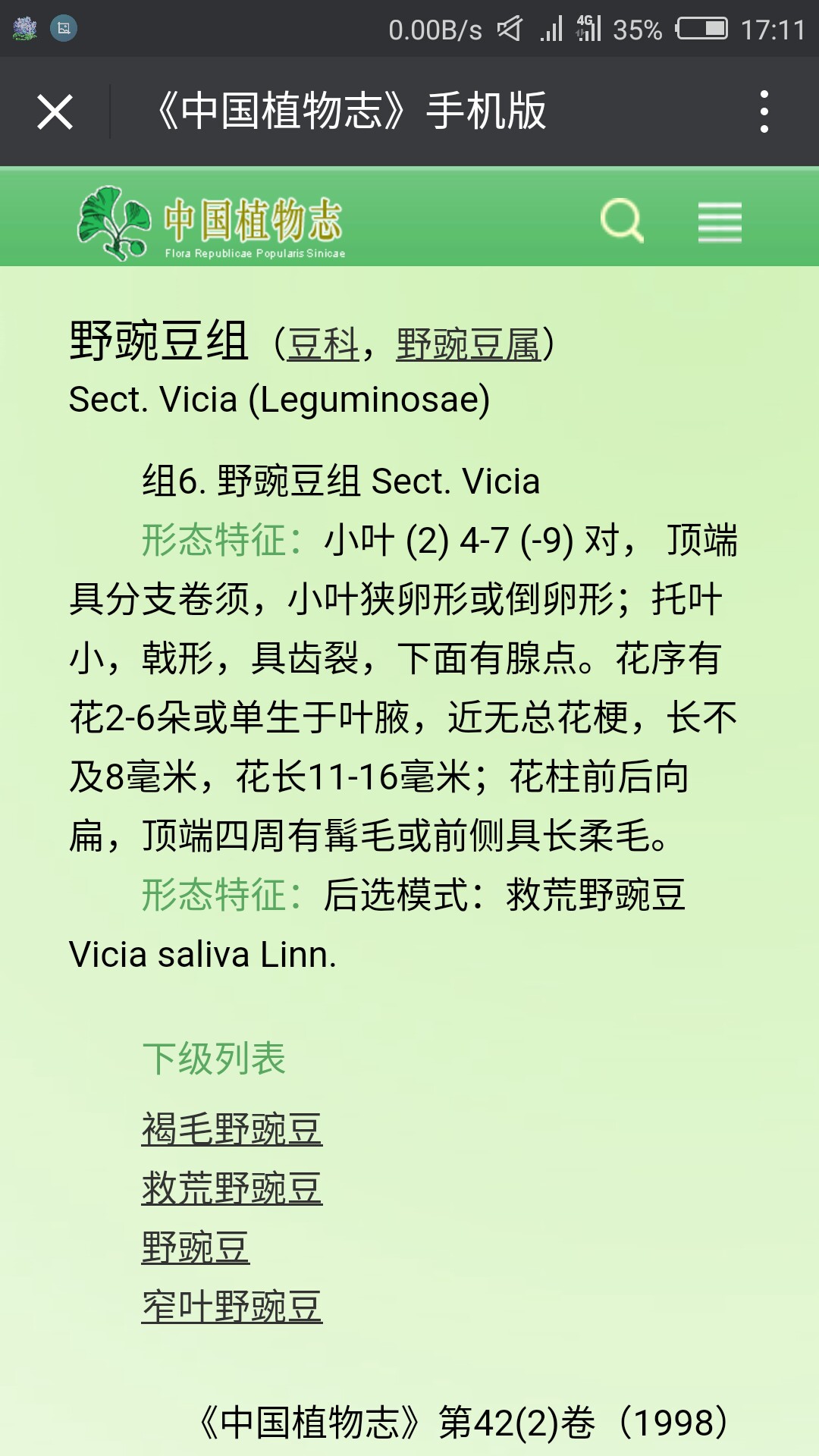 看花的部分可以直接排除窄叶野豌豆,它的翼瓣和旗瓣近等长,明显不是。接着看救荒野豌豆和野豌豆,这两个的花很像,我看不出区别。我就返回去看救荒野豌豆和野豌豆前面的区别。