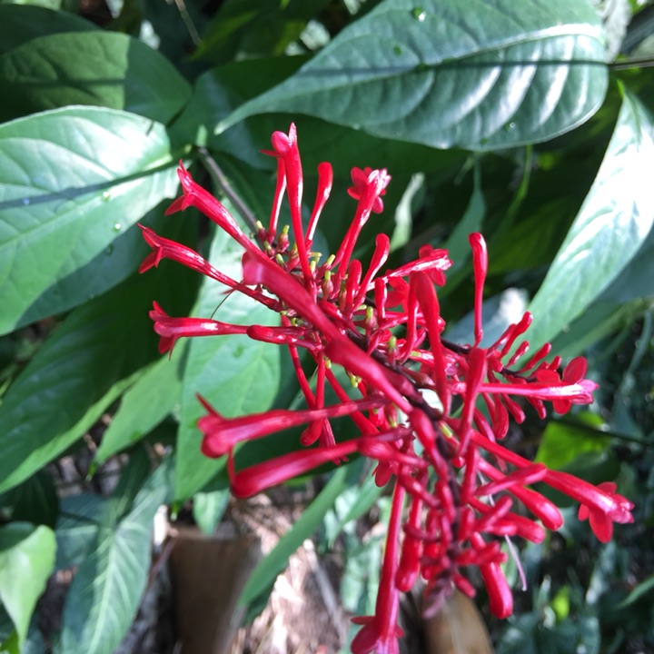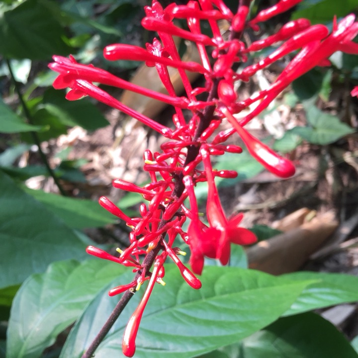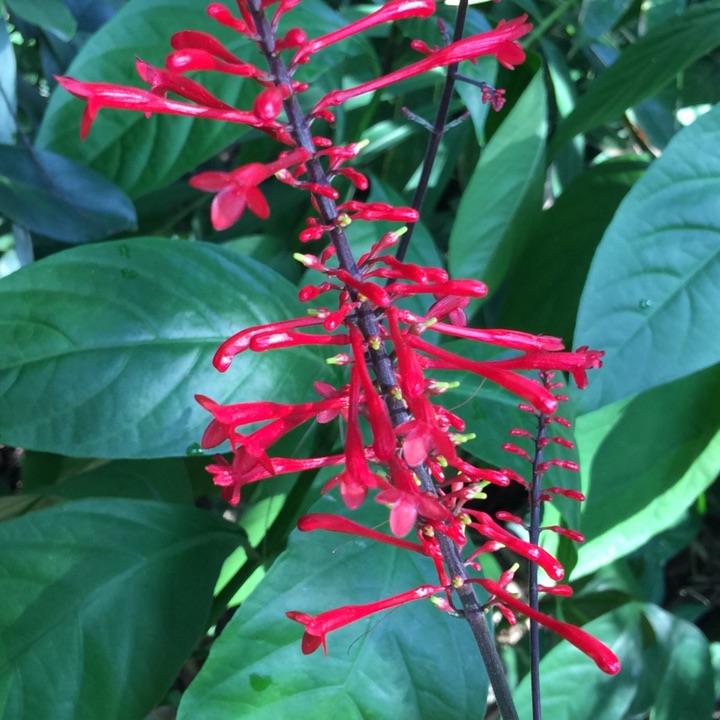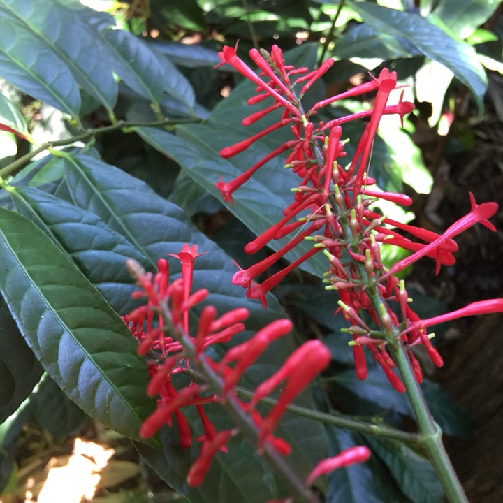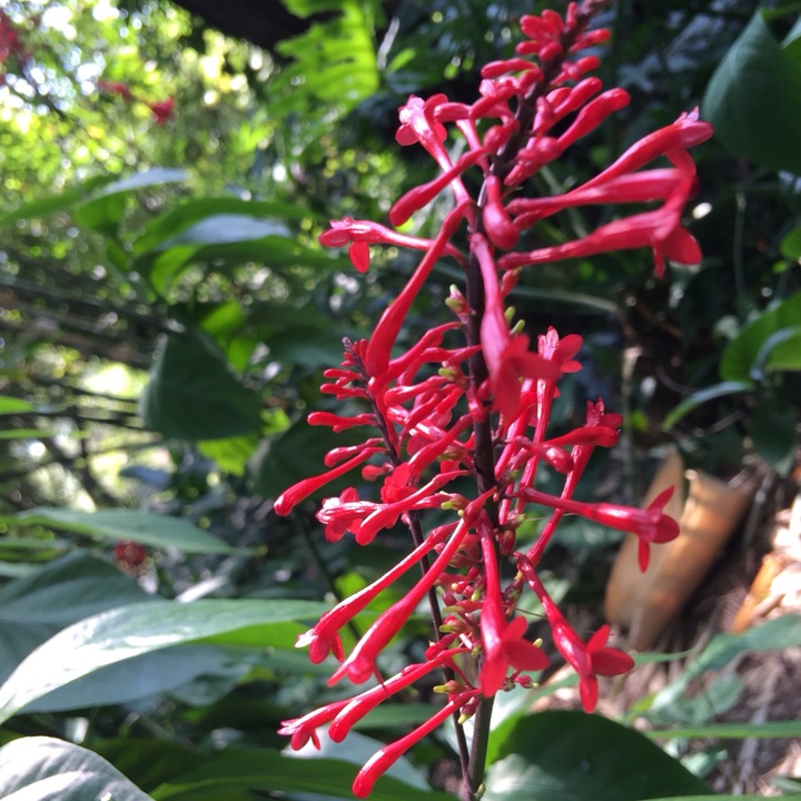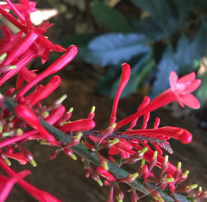 七月份在公园见过它初开,十一月中旬见它时盛开。但一直不知花名。因为我觉得它既不是一串红,也不是火焰花,更不是长隔木。不久前偶然在网上找到了它的花名。竟然一阵兴奋。