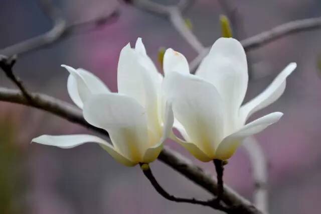 二乔玉兰是白玉兰与紫玉兰的杂交后代,开花之时非常美艳,取名“二乔”大抵也是借三国时期两位美女之名对其赞誉。