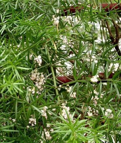 天门冬,(拉丁学名:Asparagus cochinchinensis(Lour.)Merr),别名:三百棒,武竹,丝冬,老虎尾巴根,天冬草,明天冬。天门冬根部纺锤状,叶状枝一般每3枚成簇,淡绿色腋生花朵,浆果熟时红色,为百合科、天门冬属多年生草本植物。分布于中国华东、中南、河北、河南、陕西、山西、甘肃、四川、台湾、贵州等省区。多生长于山野林缘阴湿地、丘陵地灌木丛中或山坡草丛。一般在秋、冬季采挖,洗净,除去须根,置沸水中煮或蒸至透心,趁热除去外皮,洗净,晒干备用。另外天门冬的块根是常用的中药,因此还具有很高的药用价值。(概述图参考资料来源: )基本信息