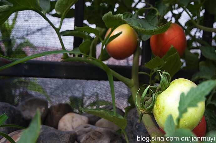 西红柿,长势喜人,结果很多,可惜很多还没红起来,就被小鸟或虫子咬了。