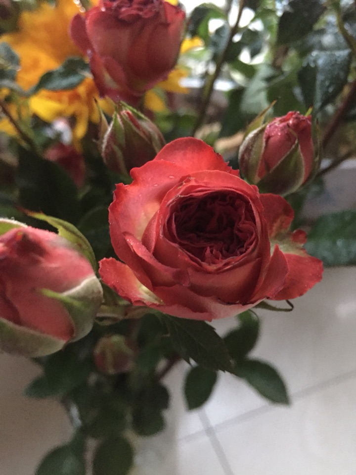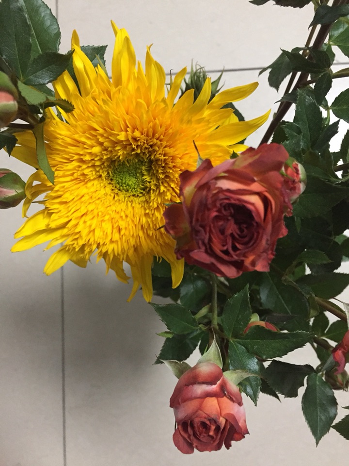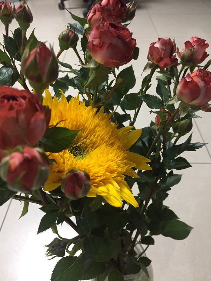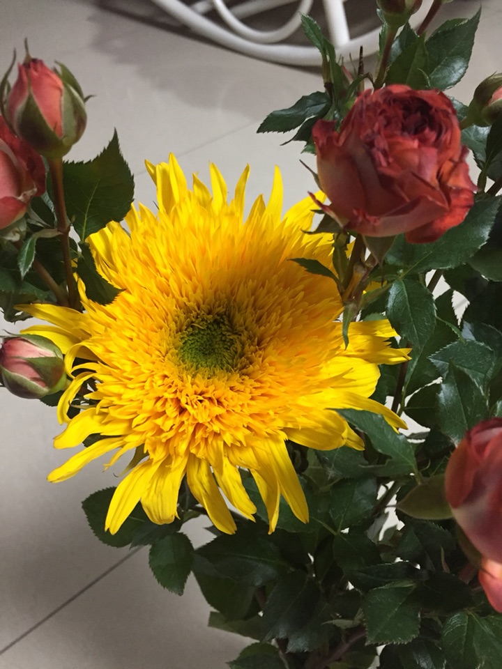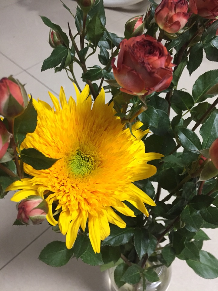 很干冷的冬天,小区里遛了一下,只见保洁人员扫的堆在一起的落叶。还是买点鲜花吧,养养眼。