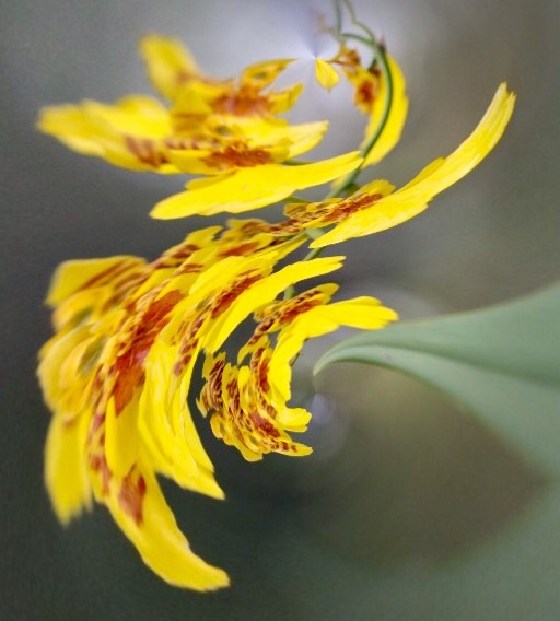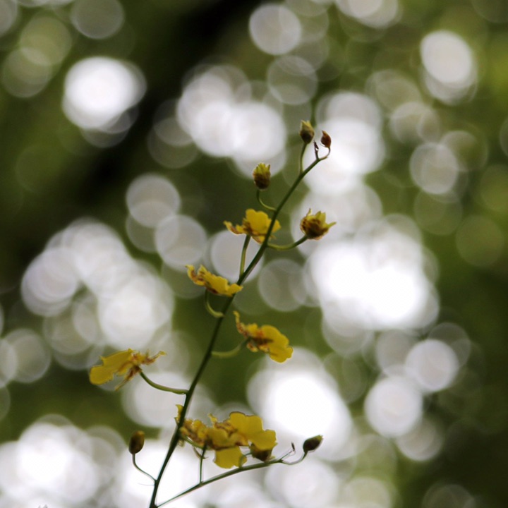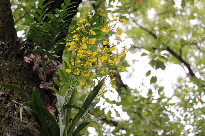 大学毕业的那个初夏之夜,漫步于校园中,偶然发现在教师宿舍楼的一个单元房的阳台上有着一盆奇特的花。色黄,亮丽,有些个茶褐色纹和斑点,花序更是变化多端,一枝直立开着十数朵花,朵朵盛开的小花在五月徐徐的夜风中摇曳生姿……顿时,我被她深深地吸引了,每天晚餐后上自修都会情不自禁地绕个路,特地去看一眼那一盆美花,从初夏到仲夏,直到毕业……虽说学校地处特区,那时候这花也是稀罕的,我每每想,真心希望哪天路过时主人恰好在阳台,可以问一问花名,结果竟无缘得见。幸而,当时我已经保研,得以出入图书馆的教师阅览室,于是乎,我借机查阅闲书资料,得知此花名为文心兰,又叫跳舞兰或舞女兰,因其盛开的花朵在微风吹拂下宛如一群穿着艳丽衣裙翩翩起舞的美丽女郎,其手、头、腰、身、裙形象之极,栩栩如生,名符其实啊!