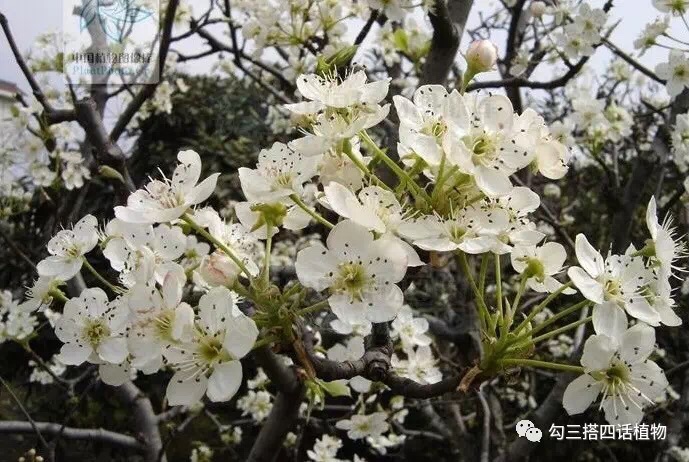 梨,蔷薇科梨属植物。花成簇开放,花梗长。花瓣五,白色,白得很纯粹,不像杏花带红晕,花瓣较圆,尖端有啮齿状,花药紫色,别具一格。