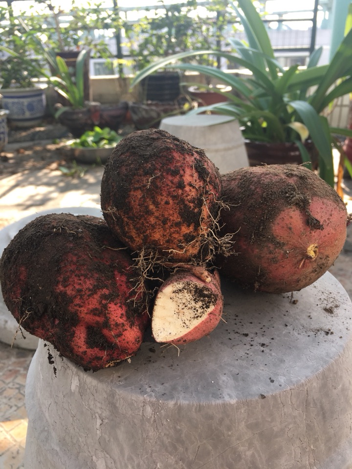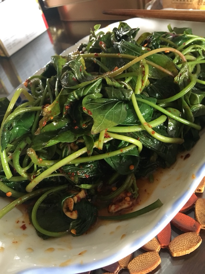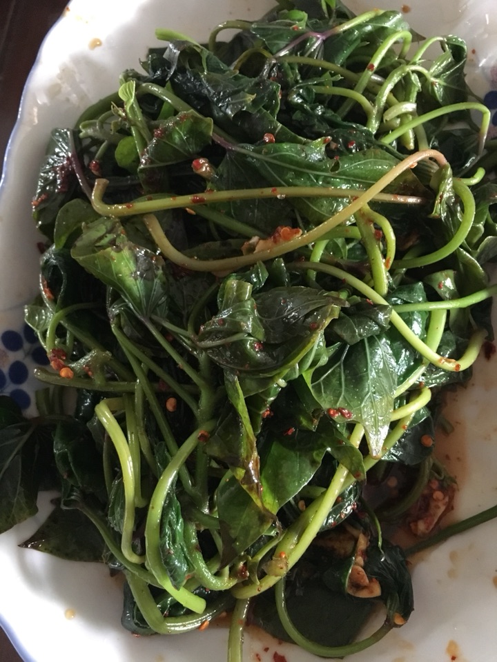 春天到菜场买些红薯埋进盆里,大半截埋土里,一小截露在土外,浇足水等发芽。两三周后就发芽了。等叶长满盆的时候,就可以连梗一起摘叶来吃了。一般是放开水里汆一下,放上自己喜欢的调料,我一般放些醋、生抽、香油、蒜泥、盐、糖、辣椒粉,拌在一起是美味呢!据说以前这吃食是喂猪的,现在说红薯叶有不少功能,于是它就成了餐桌新宠。市场上也有卖的。不时掐掐叶来吃,它会继续长。秋天挖开土,就可以收获红薯了。有一年种得太靠边,居然把我的花盆都撑破了。