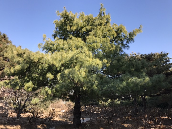 由植物园西门进入走不远便能看到一株颜色分外鲜绿的树立在路边,叶片苍翠葱茏,细柔下垂,形态亭亭如盖,凑近一看,原来是一棵松树。由于是第一次见,并不认得它是什么品种,还好,树身贴有词条——乔松