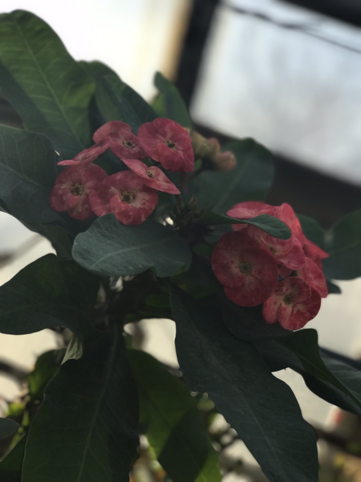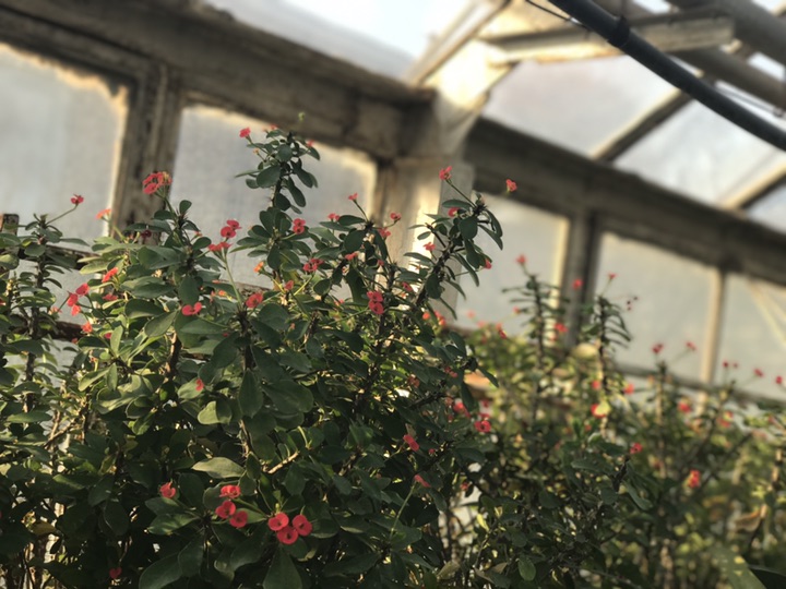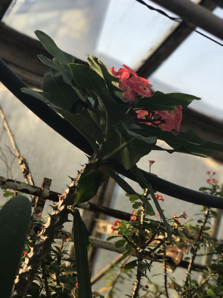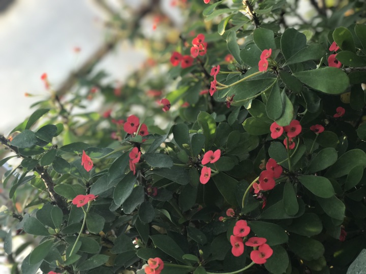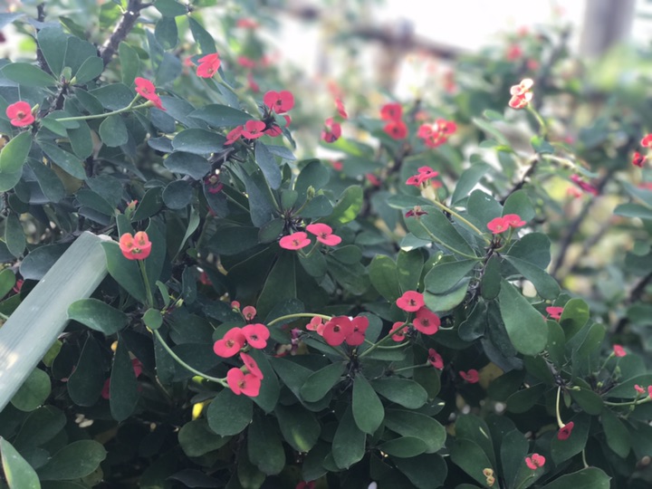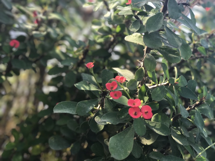 虎刺梅(学名:Euphorbia milii Ch. des Moulins):别称铁海棠,是蔓生灌木植物, 因花型似梅,而茎带刺,故有虎刺梅之称。当所有枝头上的花儿开放时,绿叶丛中数点红,星火斑斓甚是美丽可爱。虎刺梅为大戟科藤蔓状多刺植物,值得注意的是大戟属植物有个共同特点,树体受伤后伤口处会分泌出白色的乳汁,有毒,对人的皮肤、粘膜有刺激作用,误食会引起恶心、头晕等。它是植物进化过程中保护自己,防止病虫侵害的有利武器。