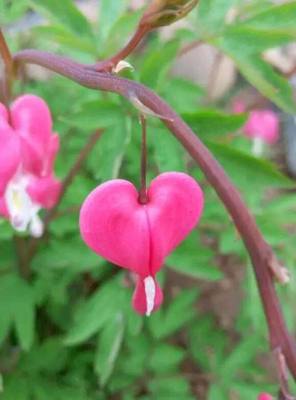 荷包牡丹又叫锦囊花。它的花瓣有四片,内部白色的花蕊从花瓣里伸出来,像是一个小小的荷包;叶子也跟牡丹花的叶子类似,所以才叫荷包牡丹。它的花期在4-6月,是一种盆栽、庭院都可以使用的花卉。