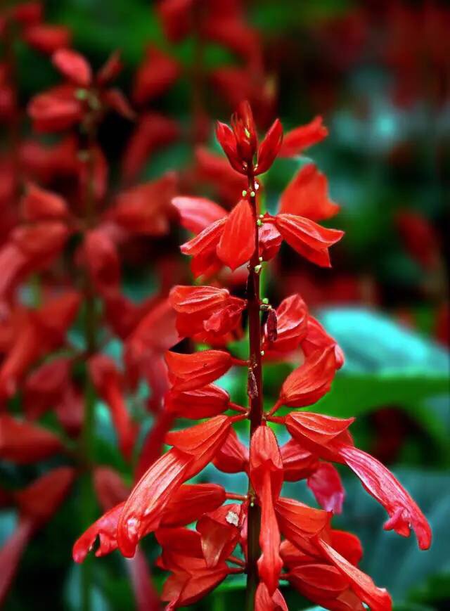 一串红又叫西洋红,花色以红色为多,色彩艳丽热烈,花开的时候好像是一串串红爆仗。一串红的花期很长,从夏末到深秋开花不断,而且不容易凋谢,是一种理想的盆栽花卉。