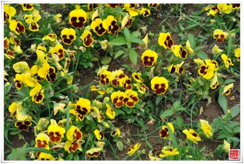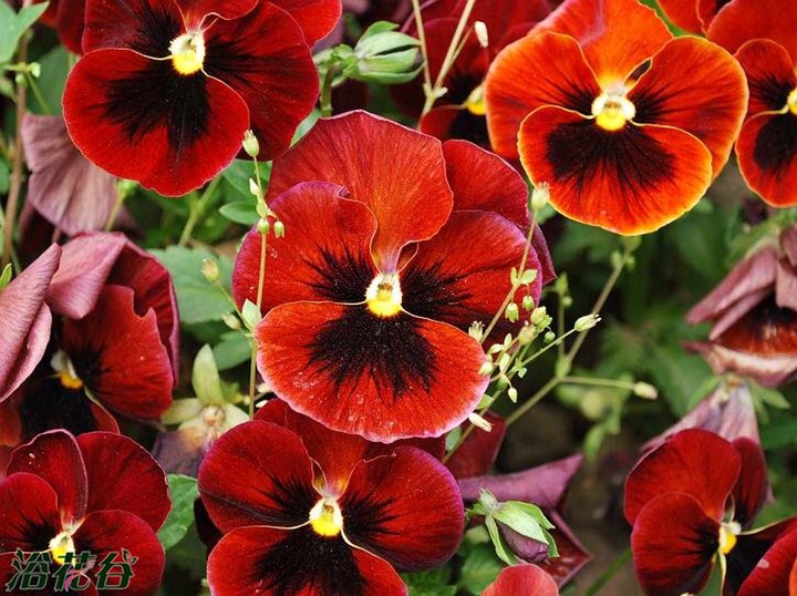 枣红色花中间有黑色圆圈的鬼脸,三色堇又叫鬼脸花,因为原种是黄蓝黑三色,中间黑色的象鬼脸,现在很多杂交的各种新品种,原种反而很少种了。