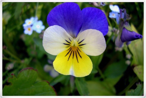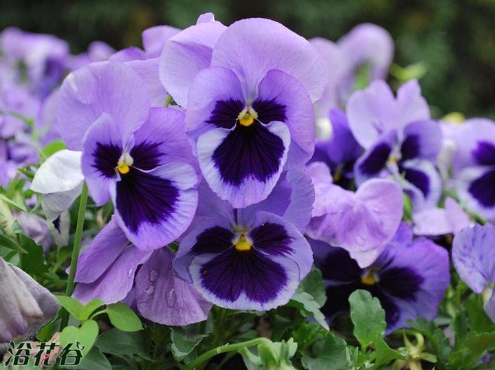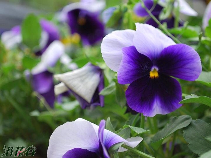 淡蓝白色花朵,中间有深蓝色圈,还是有黑圈的影子,是三色堇。