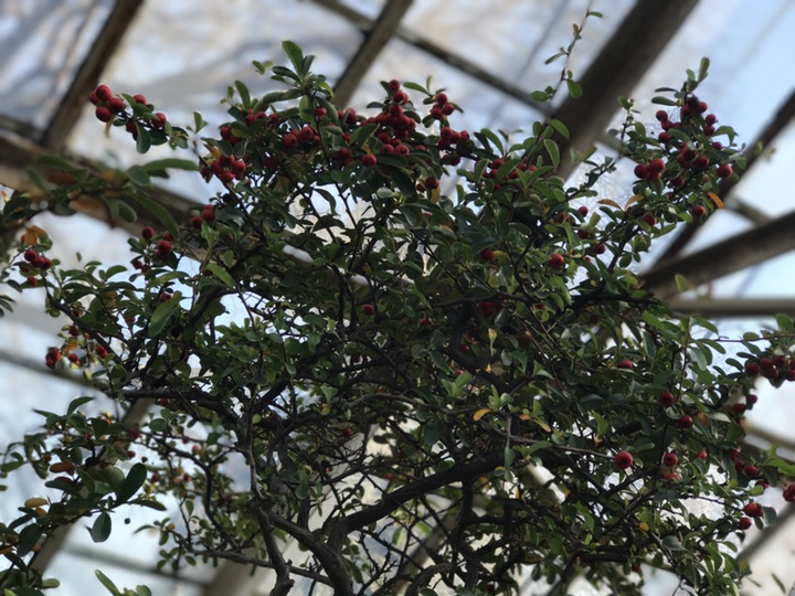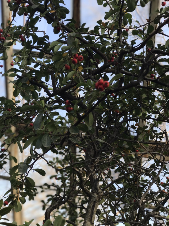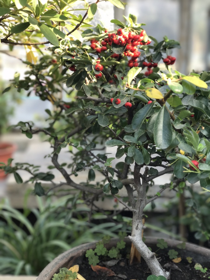 火棘为蔷薇科,常绿灌木,又称火把果、救军粮、红子刺、吉祥果,因其四季常绿,株型紧凑,枝叶繁茂,且适应性强常作为火棘球规则式地布置在道路两旁或中间绿化带或点缀于庭院之间。又因其夏有繁花,秋有红果且耐修剪,常作盆景和插花材料美丽一方。 花期4月-5月,果实一般10月成熟,颜色红艳诱人可在树上宿存到次年2月,在寒冷的冬天给人一种温暖的感觉。你可别小看了这小小的植物,它的全身可都是宝,其根皮、茎皮、果实含丰富的单宁,可用来提取鞣料。火棘根可入药,其性味苦涩,具有止泻、散瘀、消食等功效,果实、叶、茎皮也具类似药效。火棘树叶可制茶,具有清热解毒,生津止渴、收敛止泻的作用。