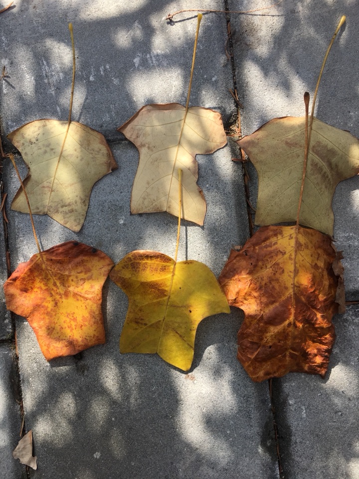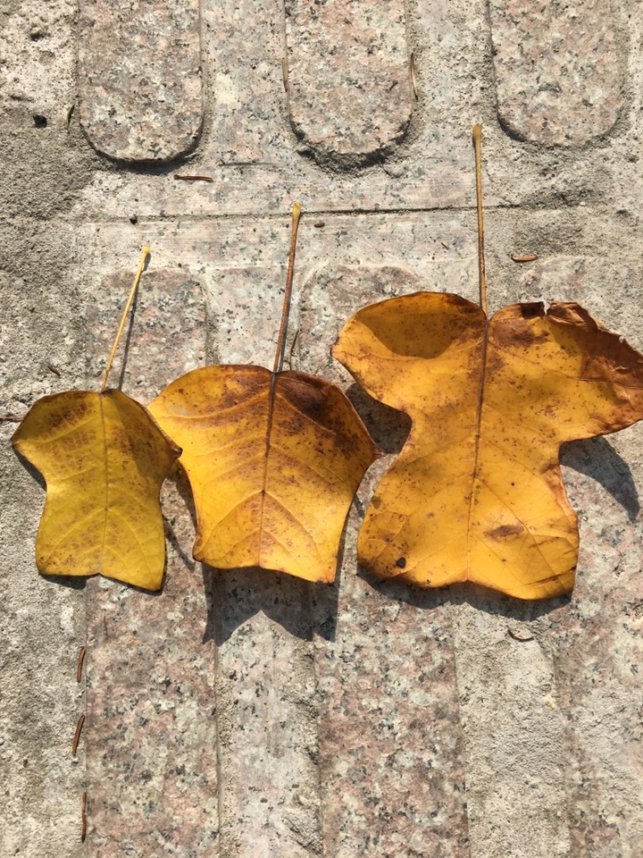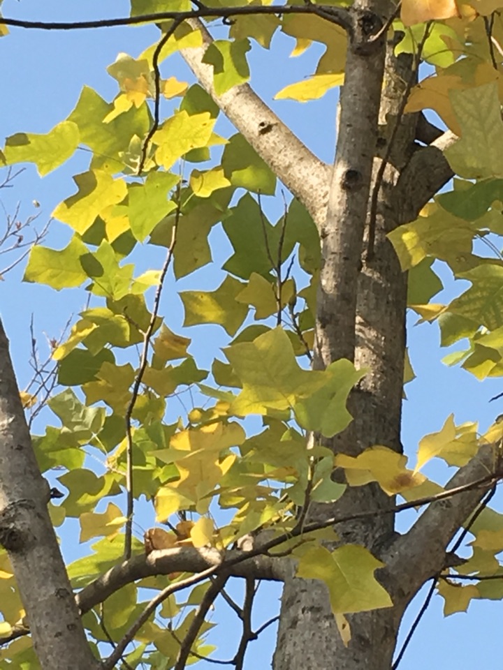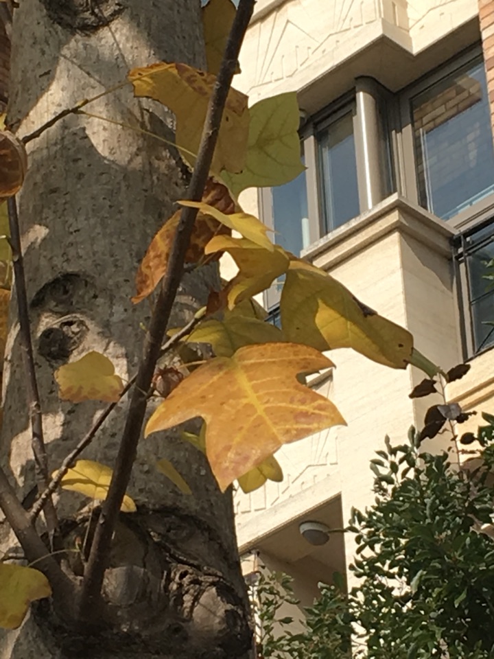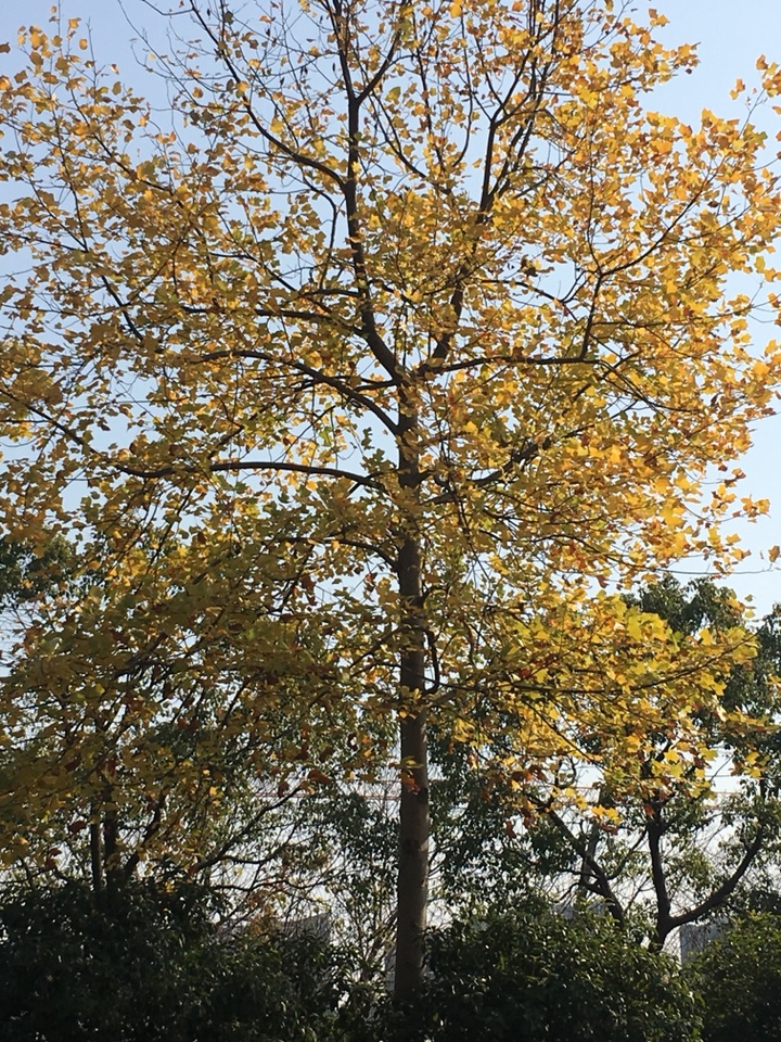 看到远处金黄一片,不是银杏,银杏叶都掉光了。是不是悬铃木,树干没那么粗,并且没有悬铃木明显的斑纹。再走近些,哇,一件一件的小马褂嘛!原来是鹅掌楸,又叫马褂木的。记得是国家一级保护植物,网上查询说是二级保护植物。