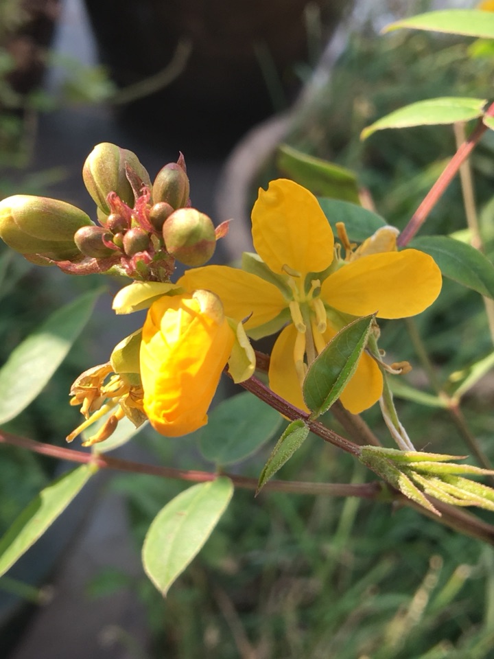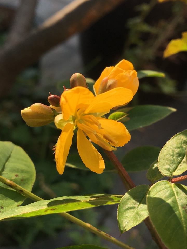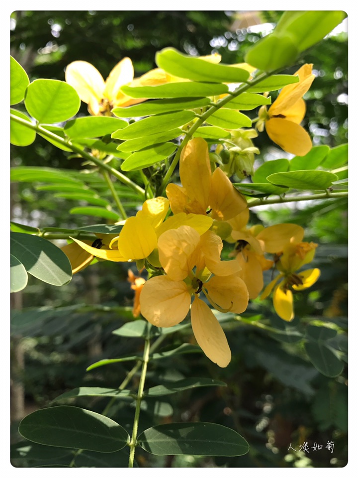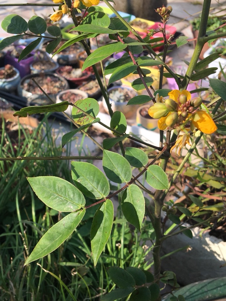 黄槐决明(学名:Cassia surattensis Burm.):灌木或小乔木,高5-7米;分枝多,小枝有肋条;树皮颇光滑,灰褐色;小叶7-9对,长椭圆形或卵形,下面粉白色,被疏散、紧贴的长柔毛,边全缘。总状花序生于枝条上部的叶腋内;苞片卵状长圆形,外被微柔毛,萼片卵圆形,大小不等;花瓣鲜黄至深黄色,卵形至倒卵形,长1.5-2厘米;雄蕊10枚,全部能育。荚果扁平,带状,开裂;种子10-12颗,有光泽。花果期几全年。