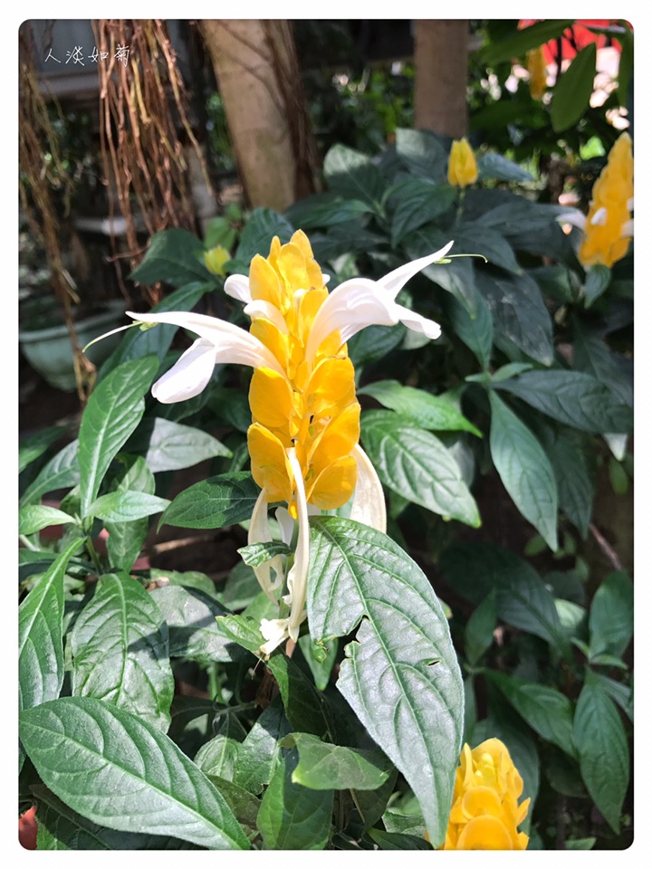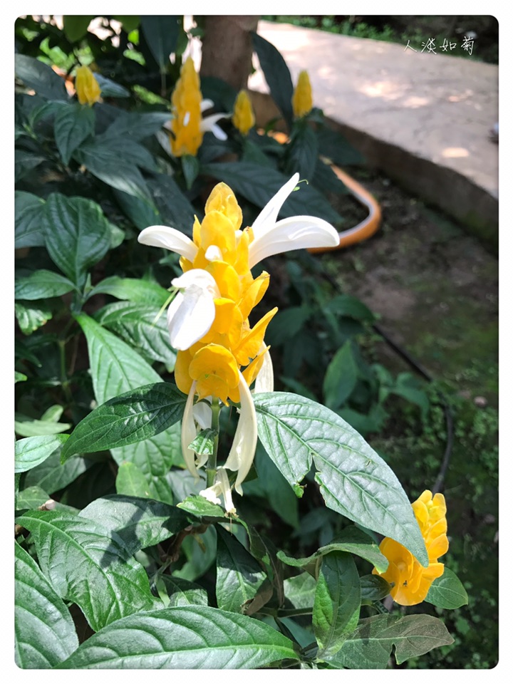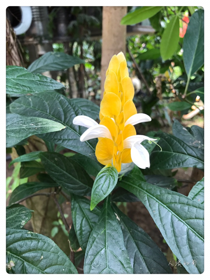 为爵床科常绿亚灌木,因其茎顶穗状花序的黄色,苞片层层叠叠,并伸出白色小花,形似虾体而得名。其实金黄色的瓣片只是起保护作用的苞片,而长在苞片上的白色二唇裂瓣片才是真正的花瓣。