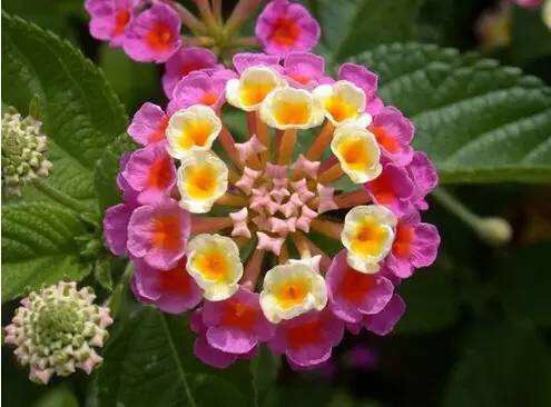 马樱丹,别称:七姐妹、五色梅、五龙兰、如意草、五彩花、臭草、臭金凤、五雷丹、五色绣球、变色草等,客家人称之为绵鼻公花,花美丽,我国各地庭园常栽培供观赏。