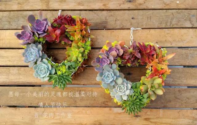 在情人节前夕,教大家制作一个七彩心形多肉花环。