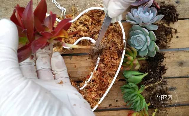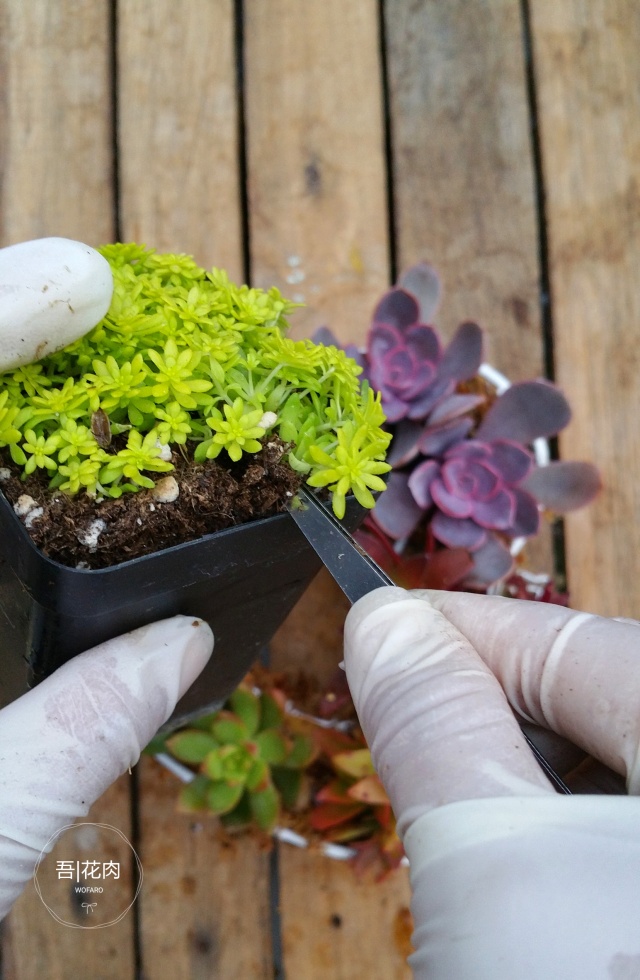 接着开始种多肉。因为是做成七彩的样子,所以顺序是从红色多肉赤鬼城开始种。