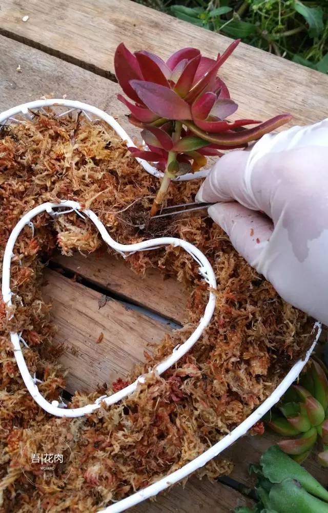 1:这次我们用水苔来代替土作为种植多肉的植料。水苔提前一天泡水10分钟后挤干水分。(不建议当天泡完当天种多肉,因为太潮湿这样容易造成多肉烂根。)把水苔填入花环中。不要填的太紧实。能插入镊子为宜。