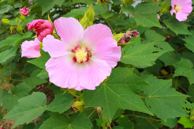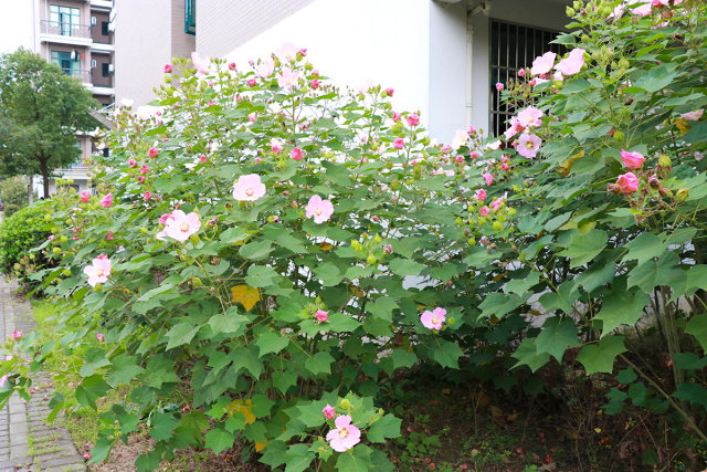 木芙蓉朝开夕合,粉红的颜色算是给一片衰败的秋天中增色不少。