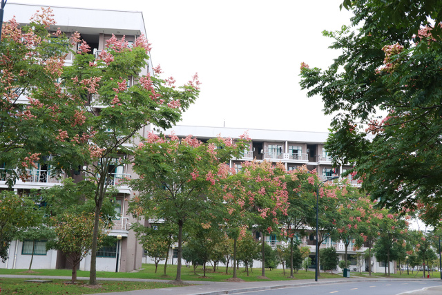 这是小编每天上下课的必经之路,路的两旁都是高大的树木,树上是红色的果子。在树上的花还没有谢掉的时候,黄色的花,红色的果子就相互映衬着,特备漂亮。