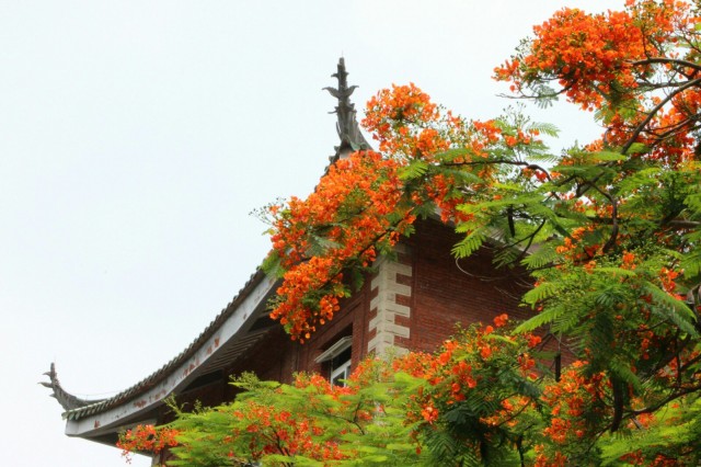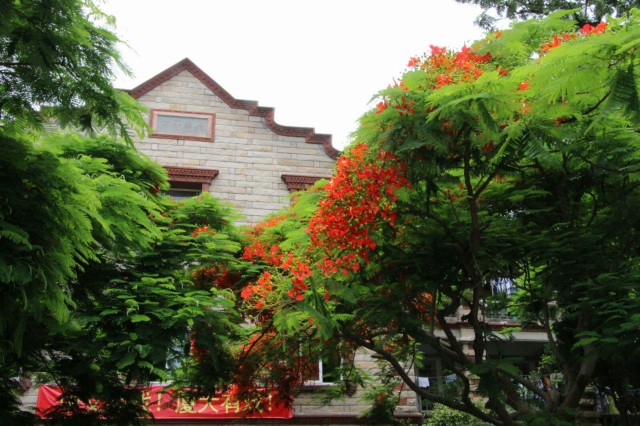 厦门大学校园内遍植凤凰花。此花一年开两次,第一季的花期是5月到7月,时间较长;第二季的花期在9月,花期短。开花的时候,红彤彤一片,格外好看。9月底,凤凰花已经结出长长的荚果。每逢花开,便是学生们相逢和离别之时,因而厦大的学生对凤凰花有一番很深的情感。有一首歌叫做《凤凰花开的路口》,据说同学们都会唱。舒婷在厦门,舒婷说她愿意是一棵木棉,木棉的枝叶触在云霄,木棉的根深埋土里,木棉是最好的爱侣。木棉开在厦大的每个角落,开在每年的三四月里,开在诗人的的笔下。