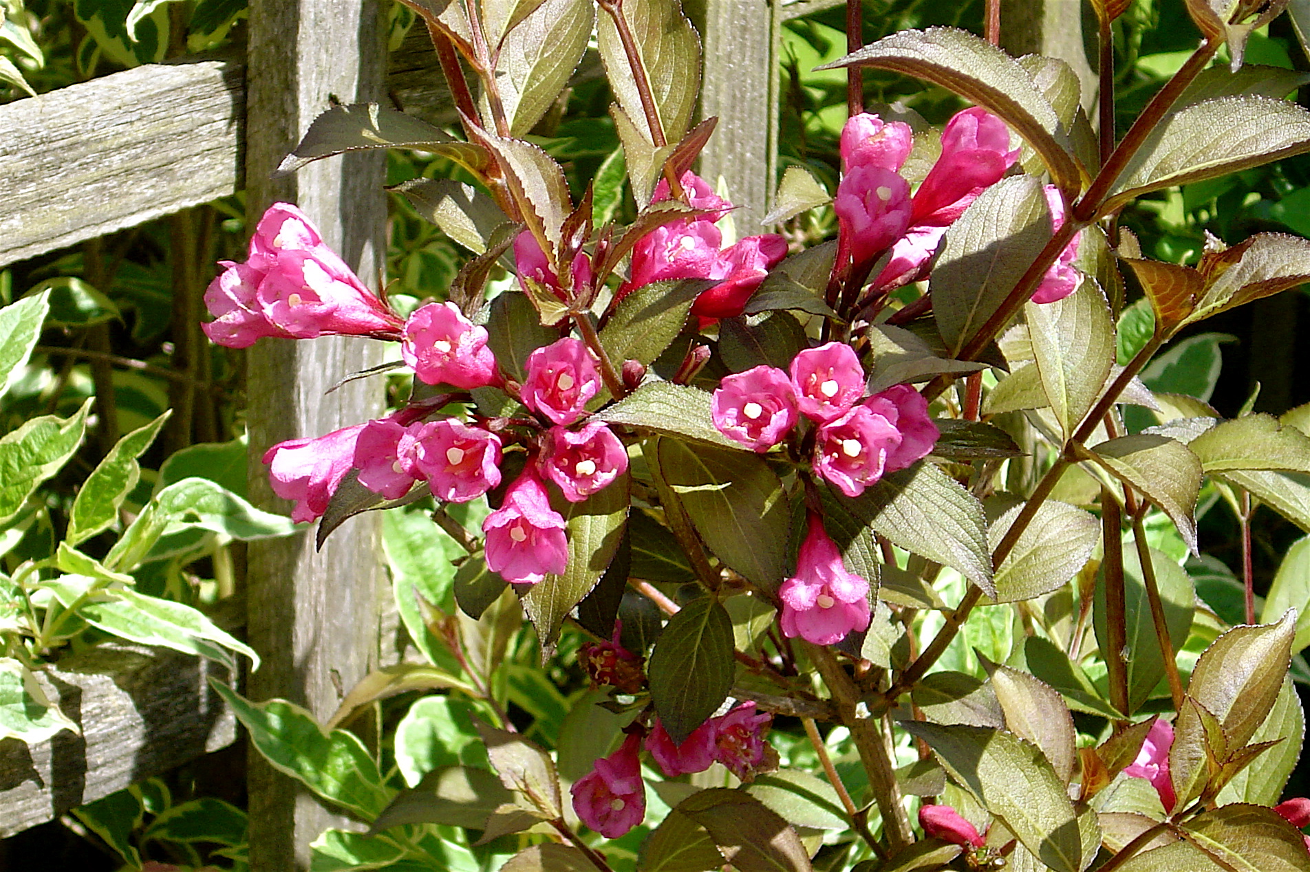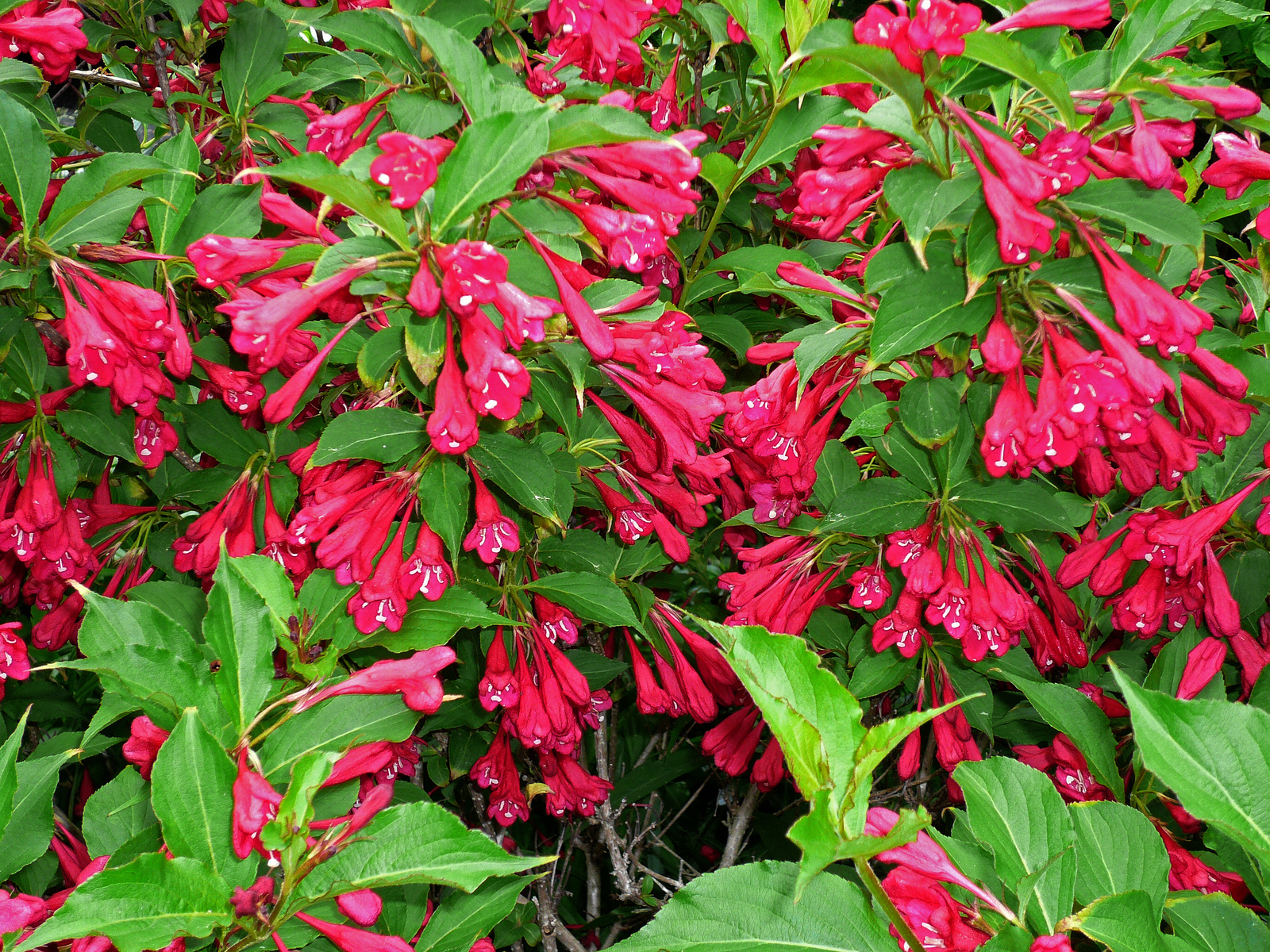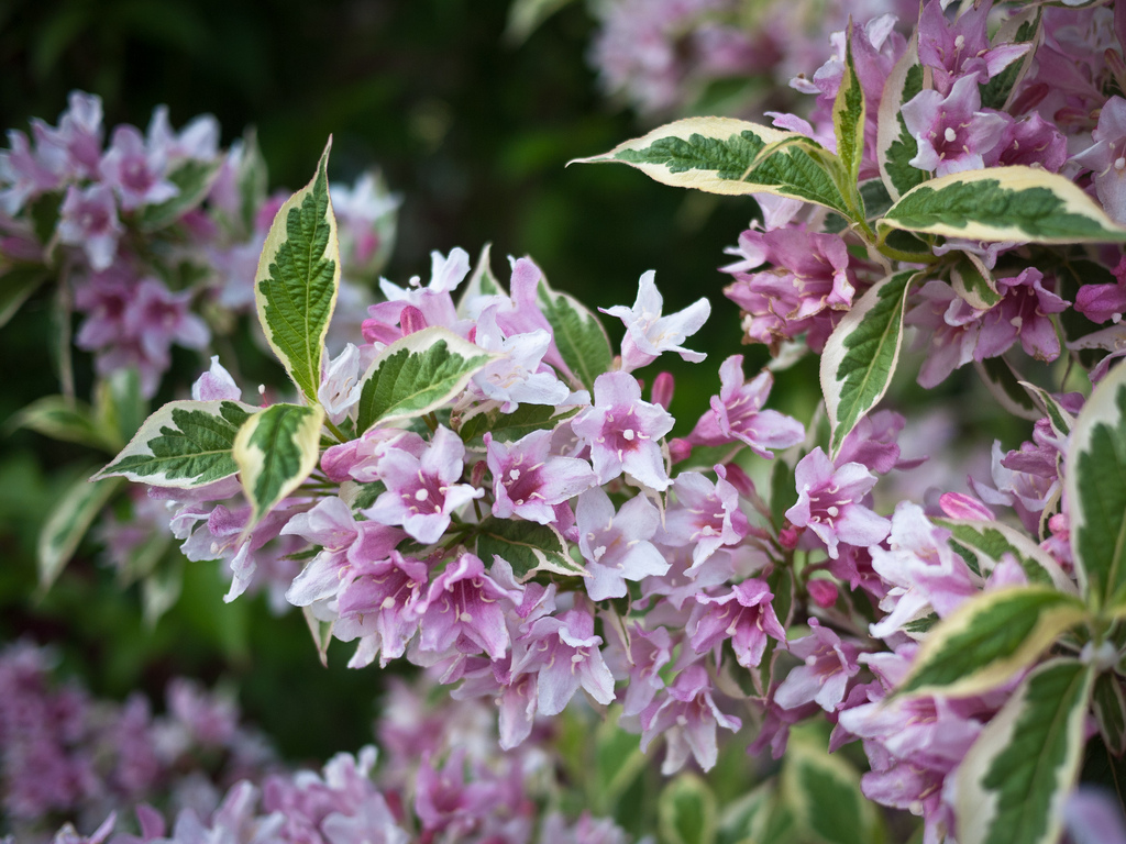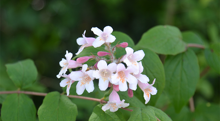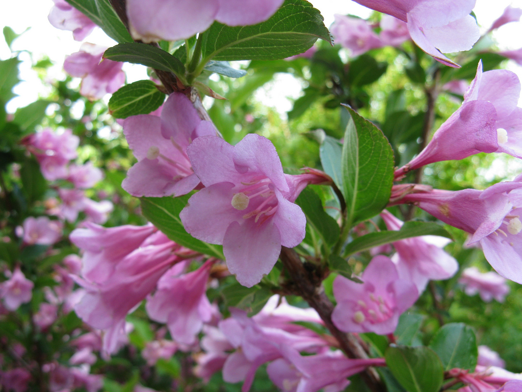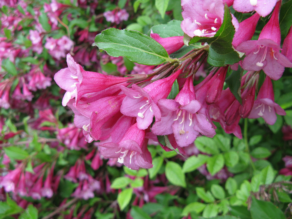 锦带花枝条纤细柔弱,浓密的绿叶旁缀满缤纷花朵,很好辨识。